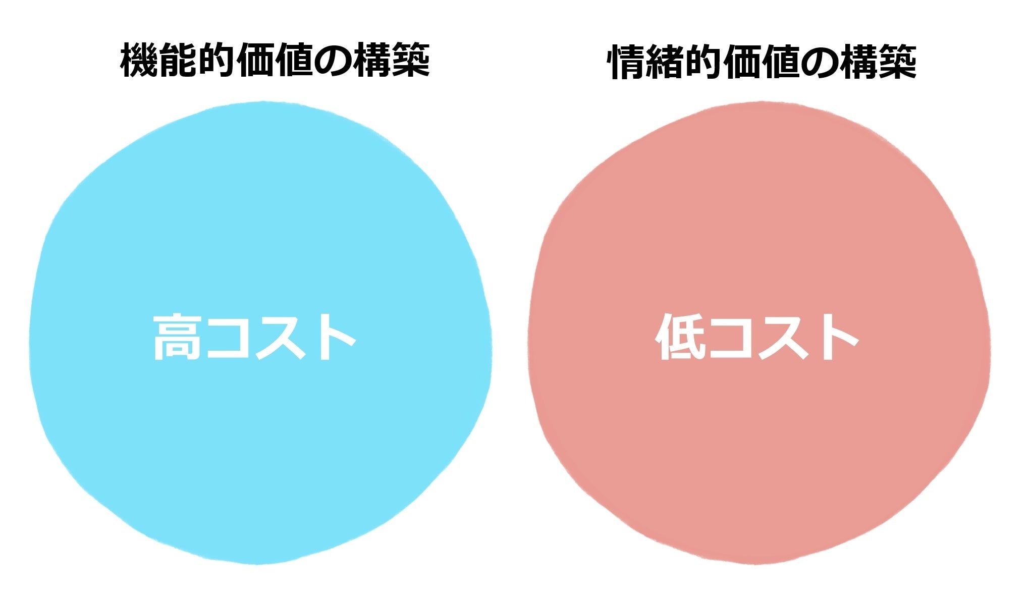 機能的価値の構築は高コストで投資コストの回収までに時間がかかりますが、情緒的価値の構築については低コストで、投資コストの回収は3〜6カ月で済む場合がほとんどです。