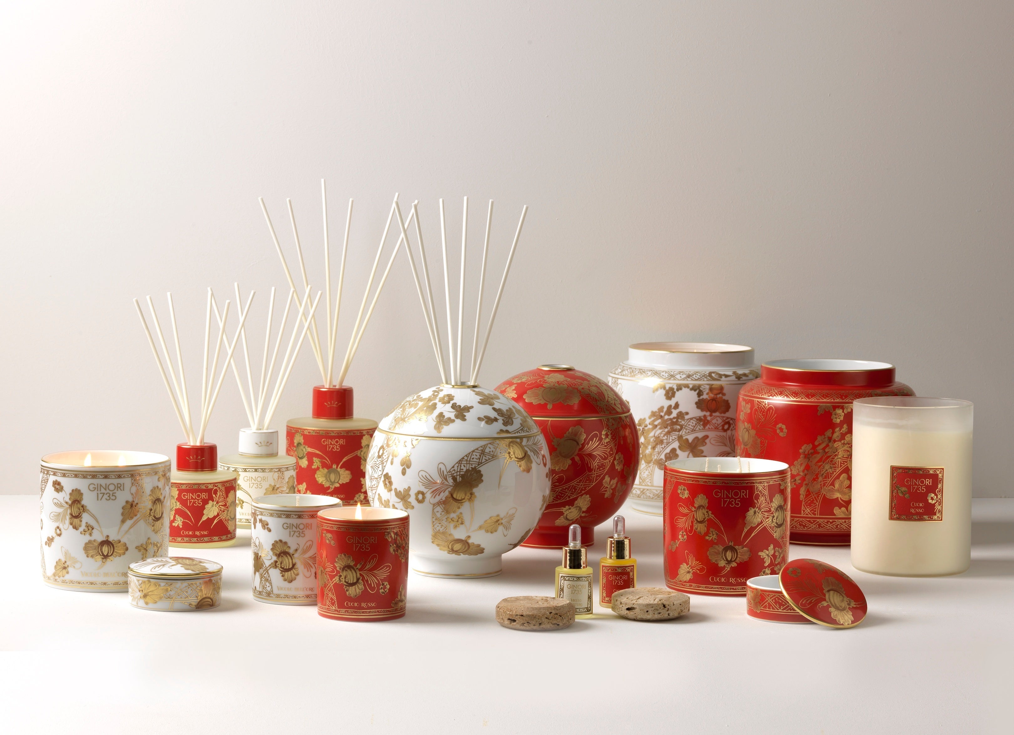 GINORI 1735を代表する磁器「アンティコ・ドッチャ・ジノリ」の優美なラインと、かつてメゾンのアートディレクターであったジオ・ポンティよって1948年に再解釈・復刻された歴史的なアーカイブ柄、カーネーションのモチーフを特徴とする。カラフルな10色展開の「Oriente Italiano(オリエンテ イタリアーノ)」に加わる新コレクションで、ゴールドの優雅な手描きフラワーモチーフが彩るホワイト地のAurum (アウルム)と、レッド地のRubrum(ルブルム)という2色で構成。高度な職人技の理念を余すことなく表現している。テーブルウェアとホームデコレーションに加え、ホームフレグランスアイテムも充実。