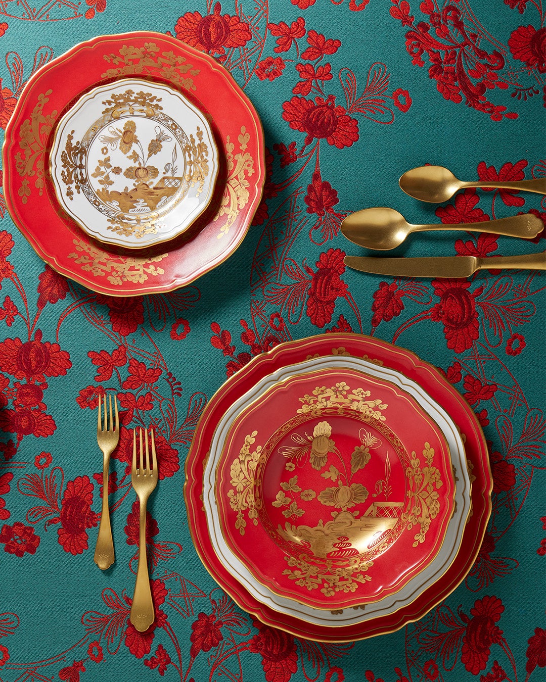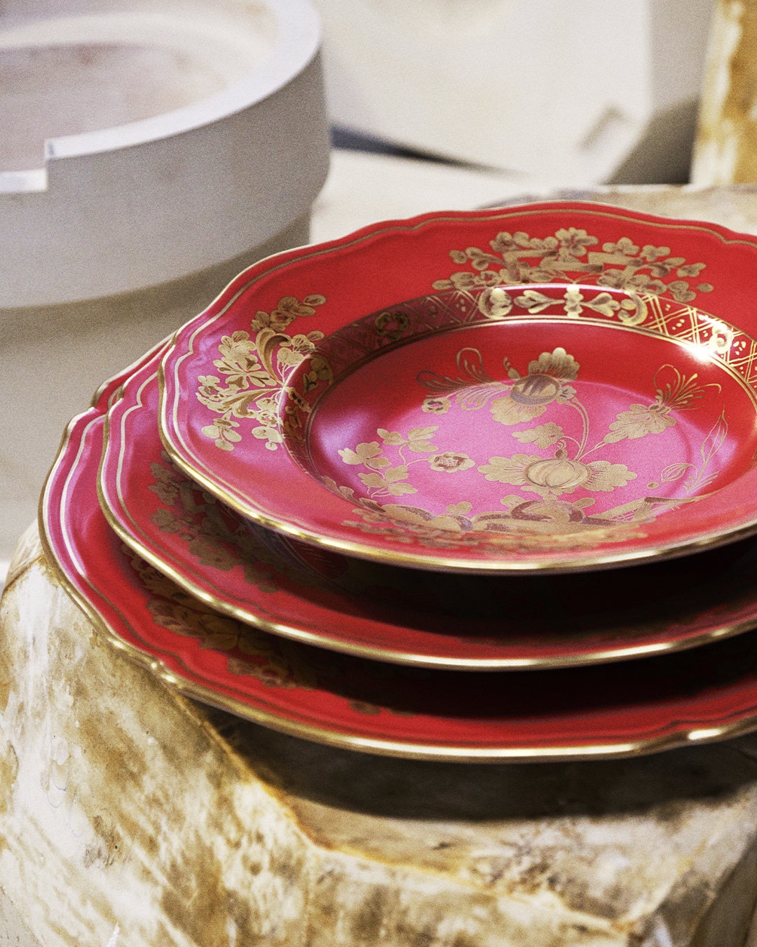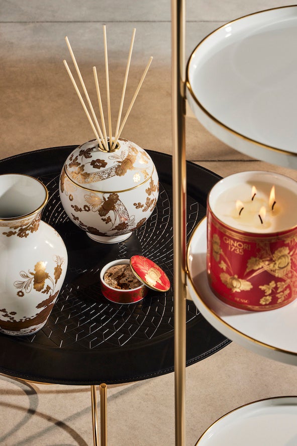 また、クリスマスや年末年始のおもてなしの食卓やギフトにもぴったりな新作の磁器コレクション「Oriente Italiano Gold (オリエンテ イタリアーノ ゴールド)」もラインナップ。優雅なゴールドのフラワーモチーフが手描きされたホワイト地のAurum(アウルム)、レッド地のRubrum(ルブルム)という華やか色彩が特徴です。GINORI 1735の代表的なコレクションのひとつ、カラフルな10色展開の「Oriente Italiano(オリエテンテ イタリアーノ)」コレクションに加わる新作で、テーブルウェアとホームデコレーションアイテムに加え、フレグランスキャンドル、キャンドルホルダー、フレグランスディフューザーなどのホームフレグランスギフトが揃います。
