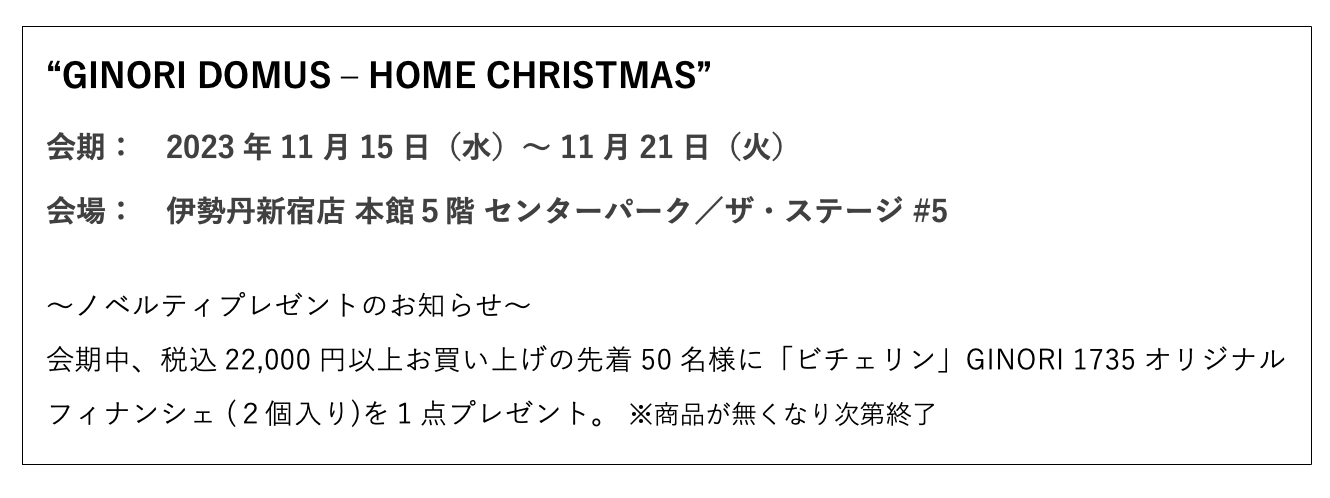 イタリア・フィレンツェの名窯「GINORI 1735(ジノリ1735)」は、冬のホリデーシーズンに向け、“ GINORI DOMUS -HOME CHRISTMAS- ”と題したポップアップを伊勢丹新宿店にて開催します。愛するご家族や大切な仲間たちとの歓びに満ちた時間を彩る選りすぐりのアイテムをご紹介します。