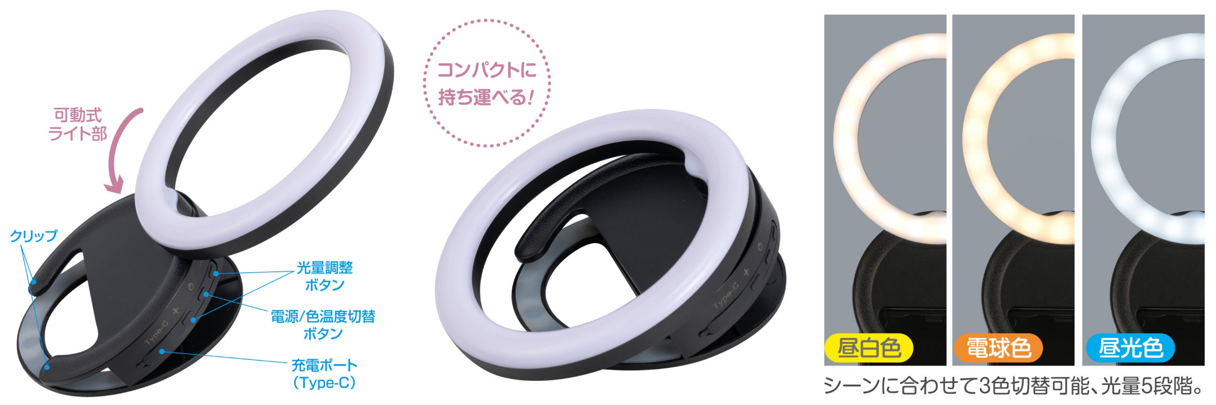 リング型のLED ライトは、光量5 段階×色温度3 段階で15 パターンの調光機能を備え、コンパクトでも