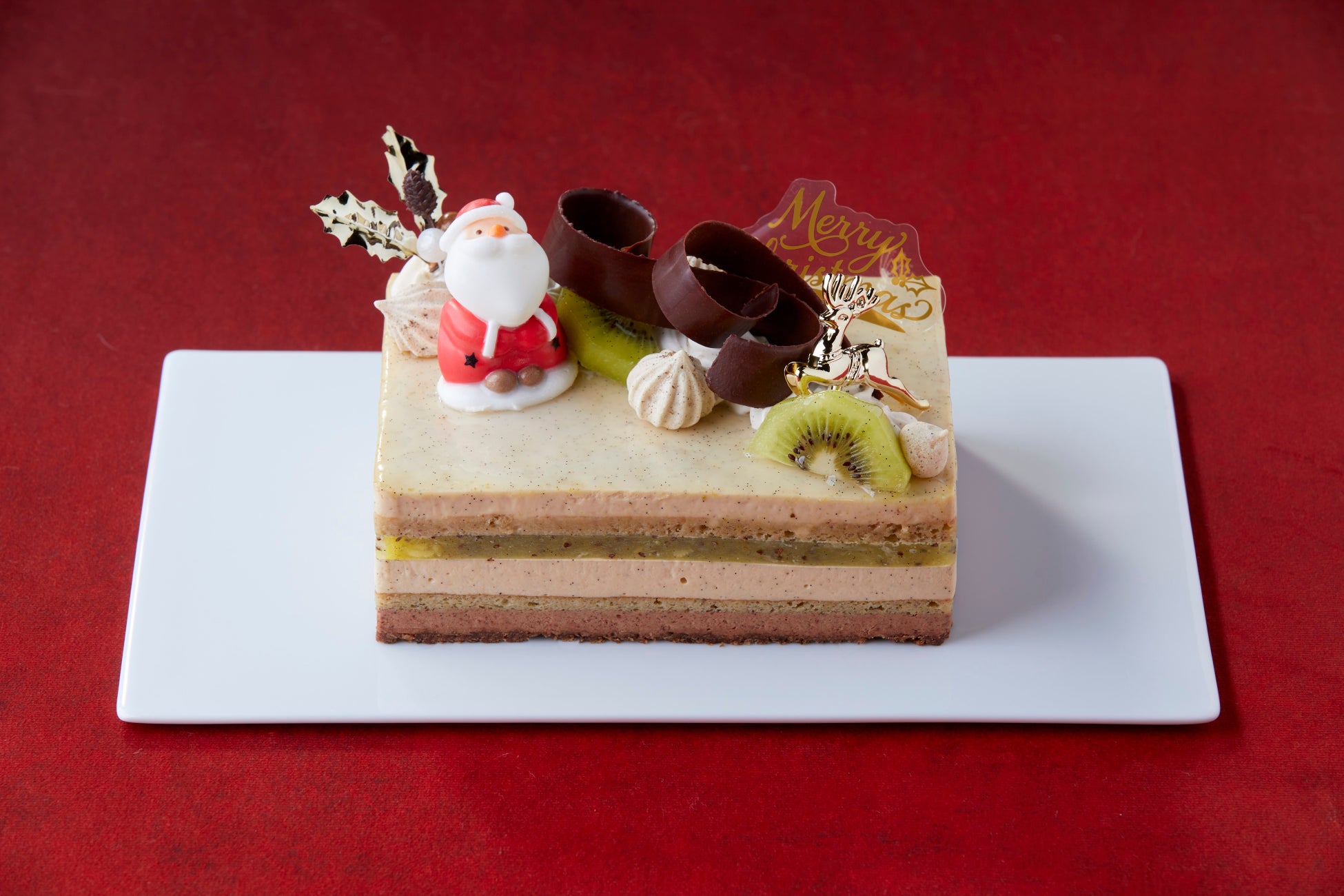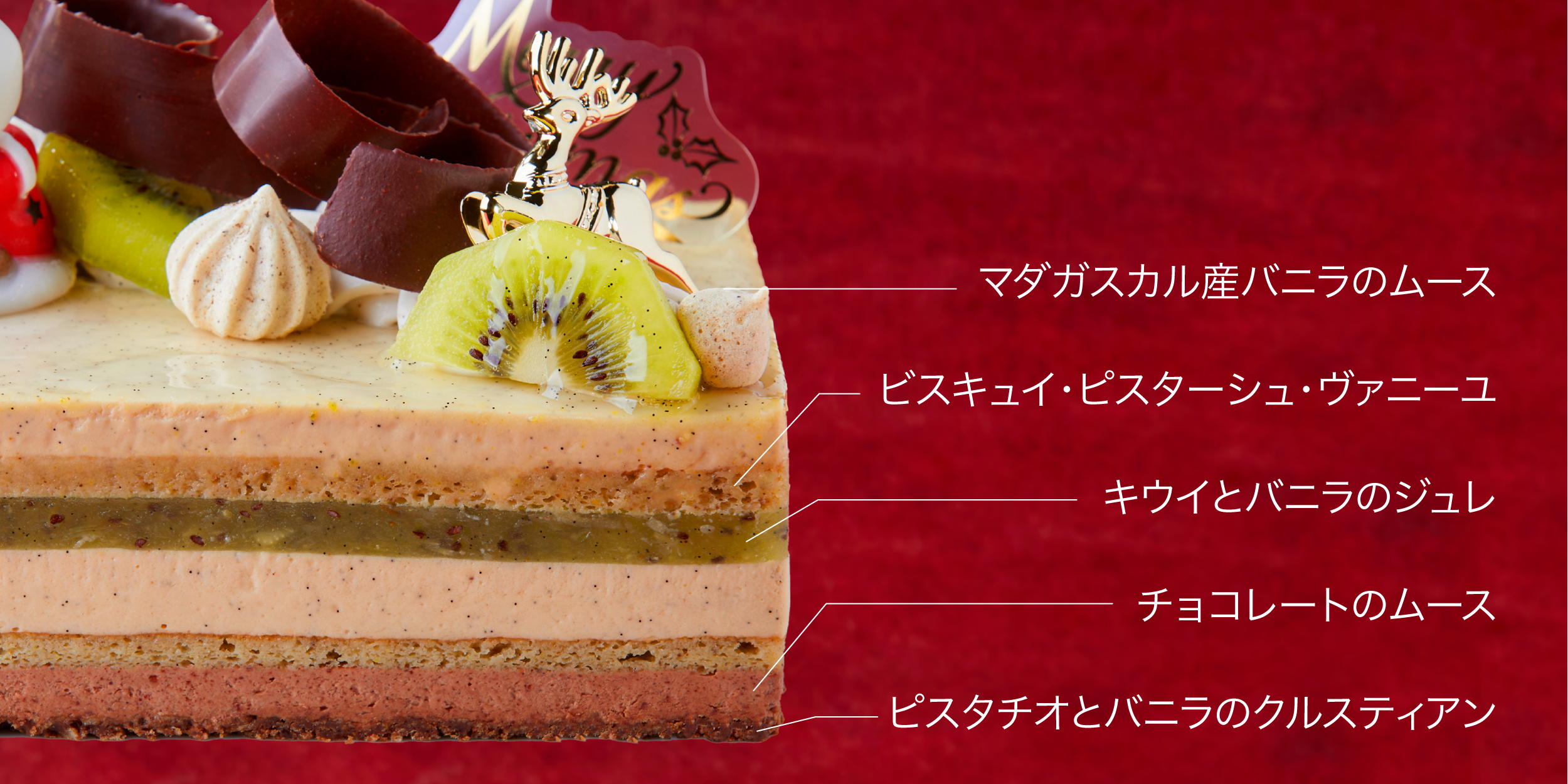 Hugh Morganより、旬のフルーツ“キウイ”をメインにしたバニラムースベースのクリスマスケーキが登場!国産のキウイは11月から春先にかけて旬を迎え、酸味と甘味のバランスが、マダガスカル産プランフォリアバニラと絶妙にマッチ。クリスマスカラーの一つ“緑”をキーカラーに、ピスタチオの生地も加え、クリスマスケーキにアレンジしました。7層の生地からなるケーキは、さまざまな食感と風味を贅沢にお楽しみいただけます。ケーキの上には空を見上げるサンタクロースのモチーフに、バニラの生クリームやバニラのメレンゲ、そしてBean to Bar のチョコレートブランド“Minimal - Bean to Bar Chocolate –”のチョコレートをデコレーション。ピスタチオのコクと果実味ある濃厚なチョコレートの味わいが、キウイの甘酸っぱさとバニラをまろやかに繋いでくれます。