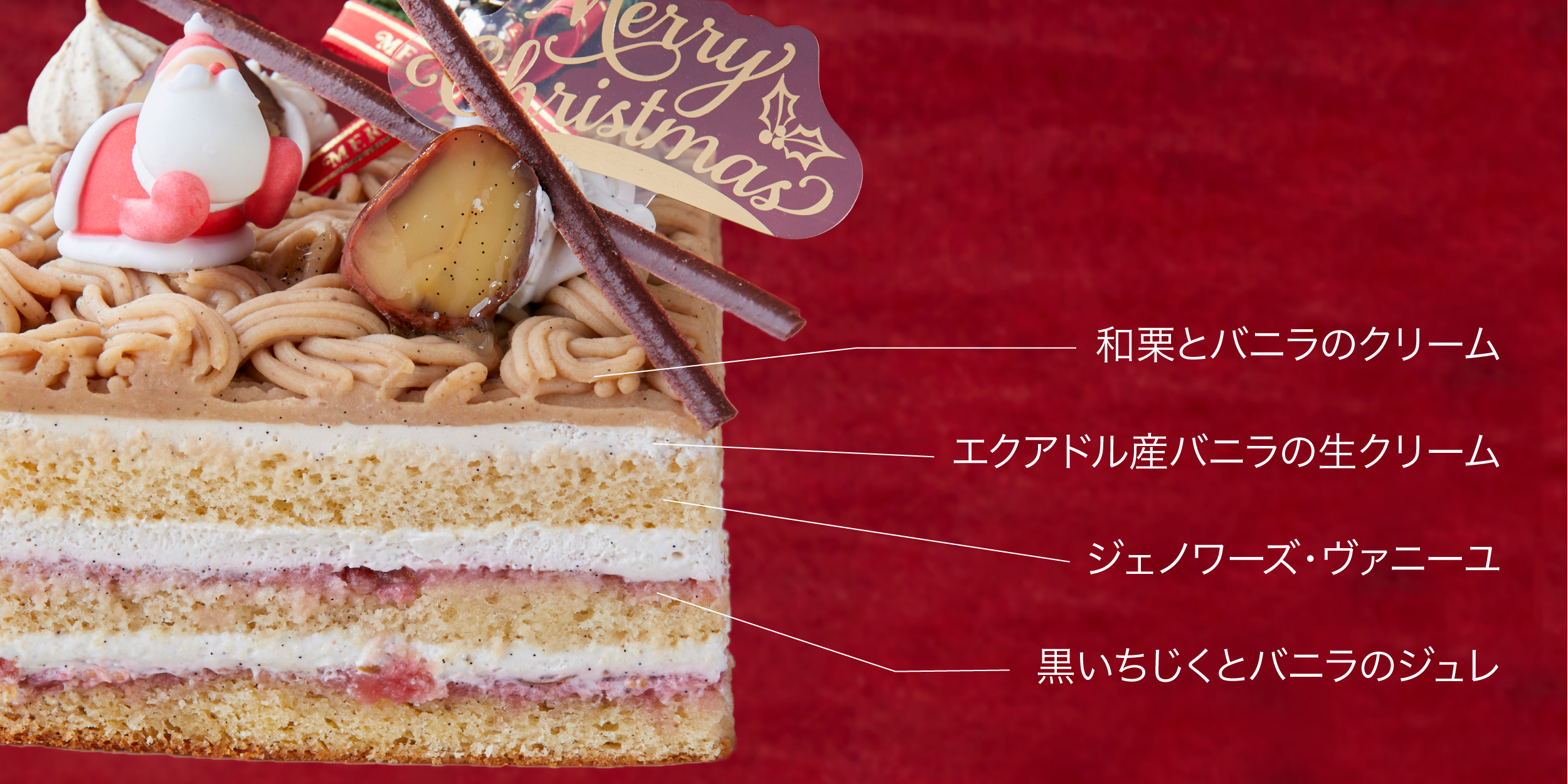 エクアドル産タヒテンシス品種バニラと、今が旬の食材である高知県四万十産の地栗、そして「黒いダイヤ」とも称させる新潟県佐渡島産の黒イチジクを使ったモンブランをクリスマスケーキに仕立てました。トップには、糖度の高い和栗をペースト状にし、バニラの生クリームと混ぜ合わせた贅沢なマロンクリームをたっぷりデコレーション。そしてバニラパウダーを入れて焼き上げたジェノワーズ(スポンジ)にバニララムとバニラシロップを打ち込んだアンビバージュで、バニラクリームや黒イチジクのジャムをサンドしました。栗と黒イチジクの濃厚な味わいや風味を残しつつ、こってりとしすぎないケーキに仕上げています。この時期にしか味わえない食材と、エクアドル産バニラの芳醇な香りを、この機会にぜひご堪能ください。