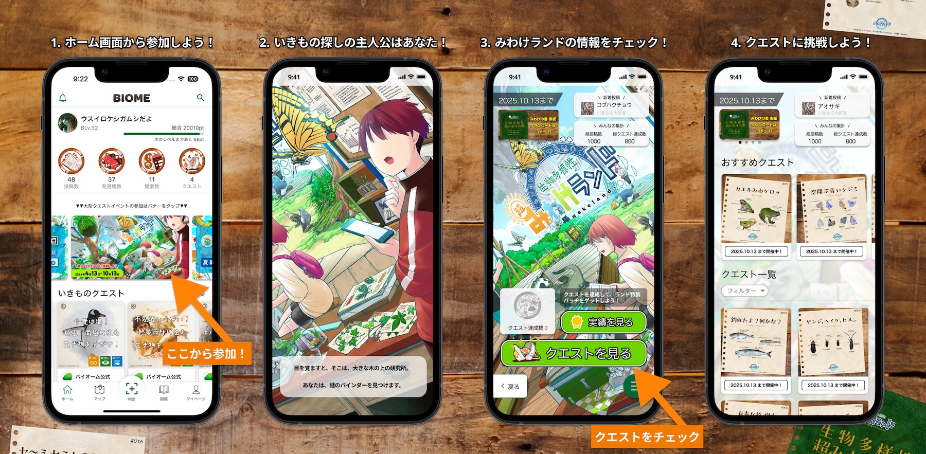 「生物多様性 超みわけランド」は、いきものコレクションアプリ「Biome(バイオーム)」を使って、身近ないきものの見分け方を楽しく学ぶことができるアプリイベントです。