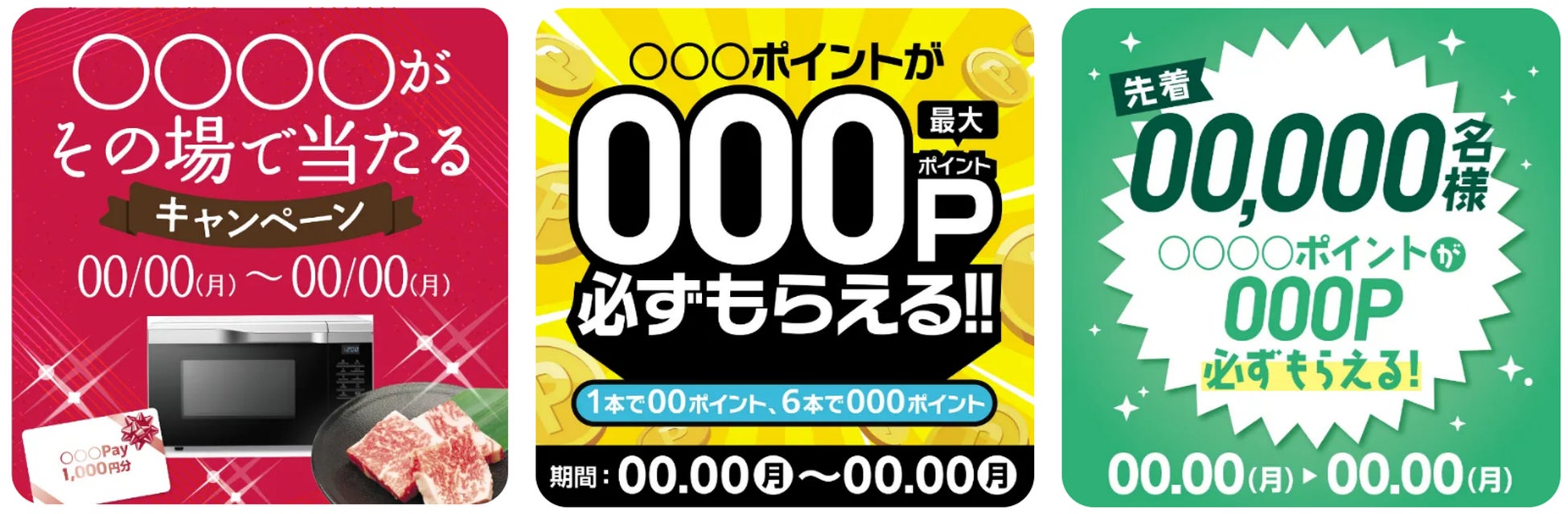 ➀インスタントウィン、②必ずもらえるキャンペーン、③先着で必ずもらえるキャンペーンの