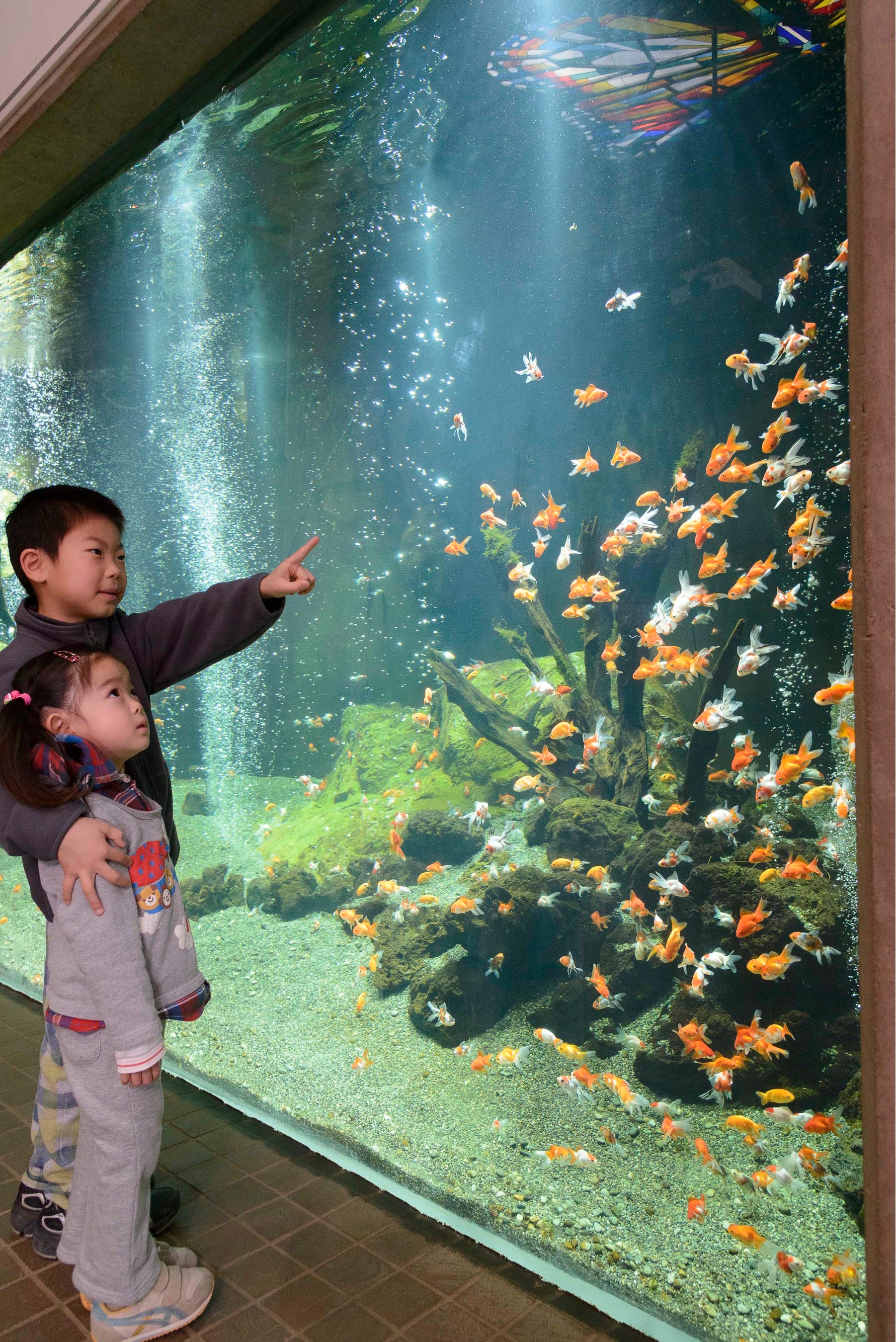・生物園に入ってすぐ、正面にある大水槽では約35種類の金魚が華やかに泳ぎます。