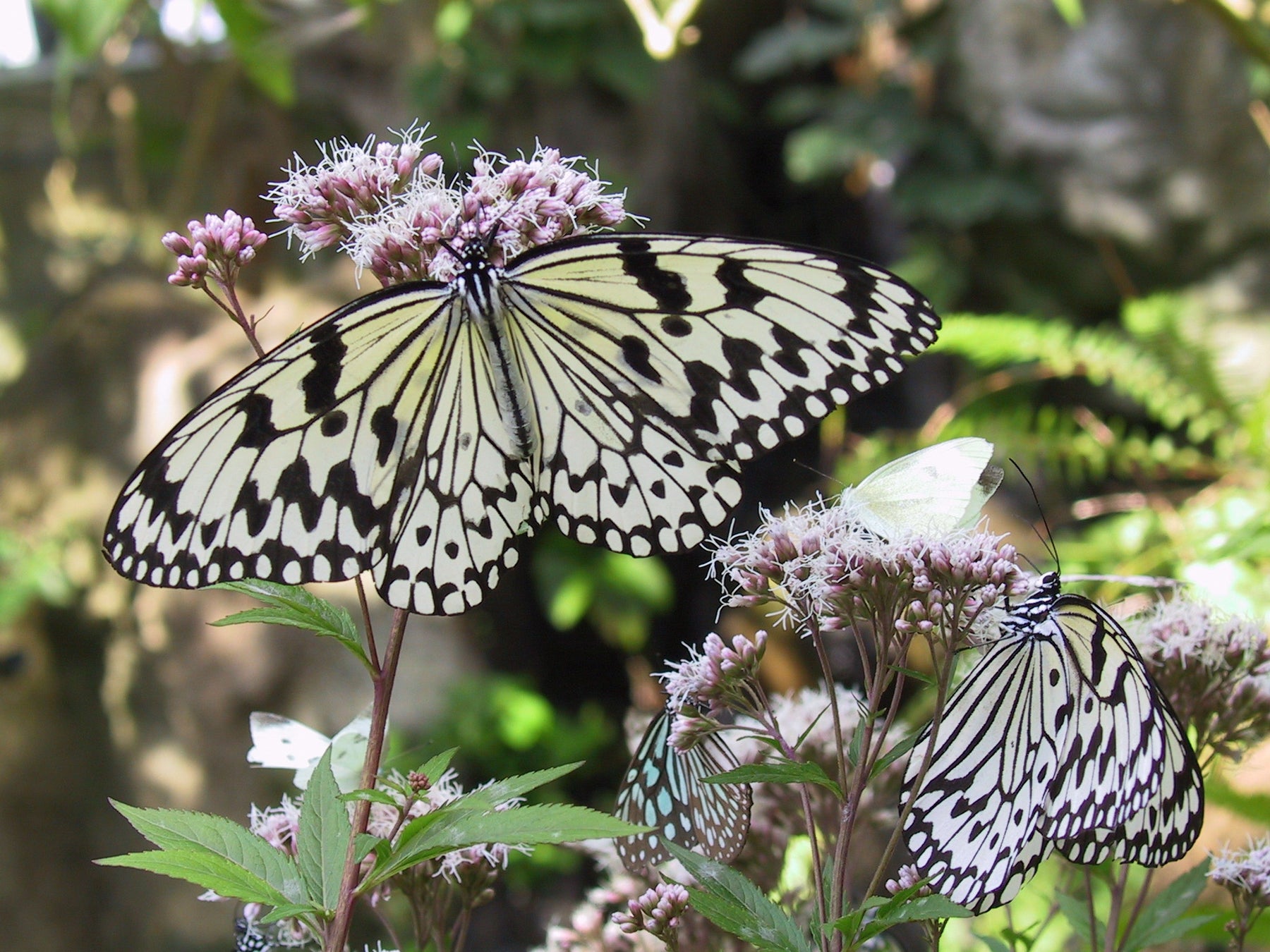 ・南国の蝶が飛び交い、アマゾンの大魚ピラルクや、「人喰いナマズ」の異名を持つジャウーが泳ぐ水槽もある大温室は、自由に中を歩き回ることができます。
