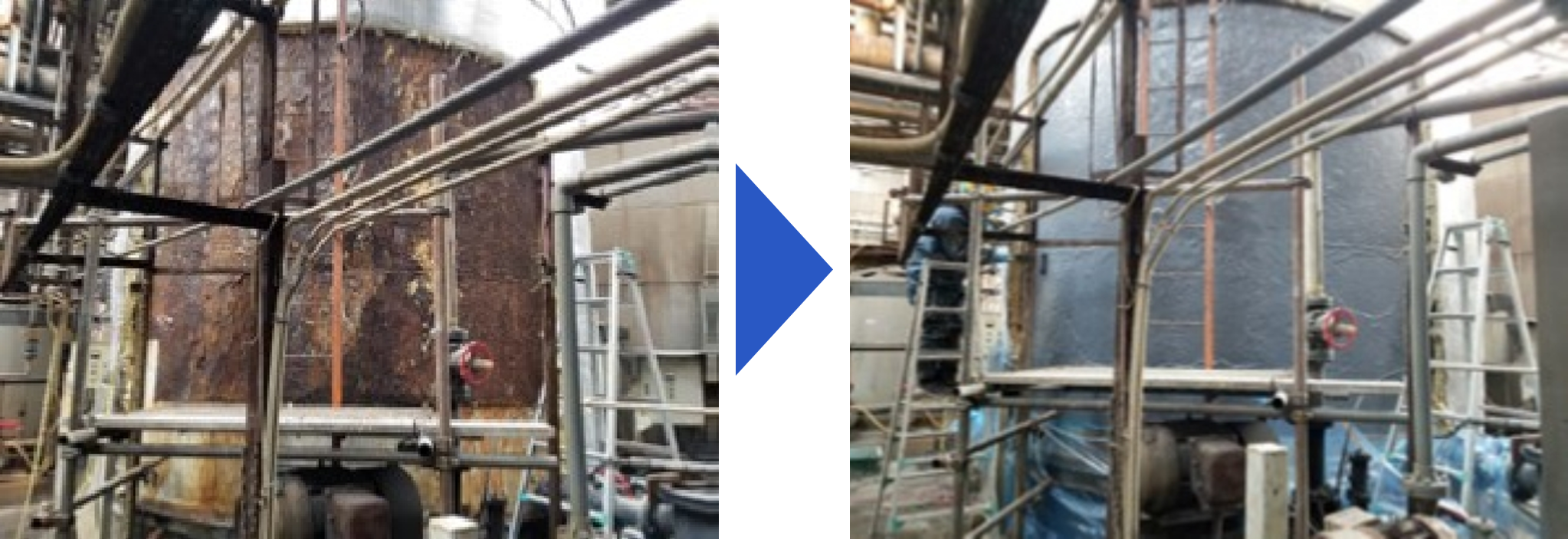 まずはケレン処理を実施して錆を取り除き、塗装の準備をしました。 欠損部分については、パテで補修・補強した上で、コーティングを実施。 特殊密着補修コーティングを実施した結果、水漏れを防ぐことができ、ボロボロだったタンクが見違えるほど、 キレイになりました。