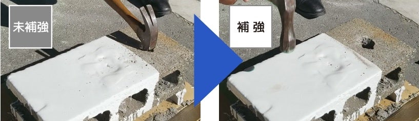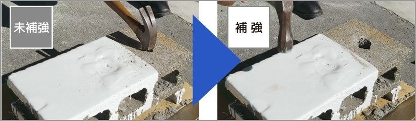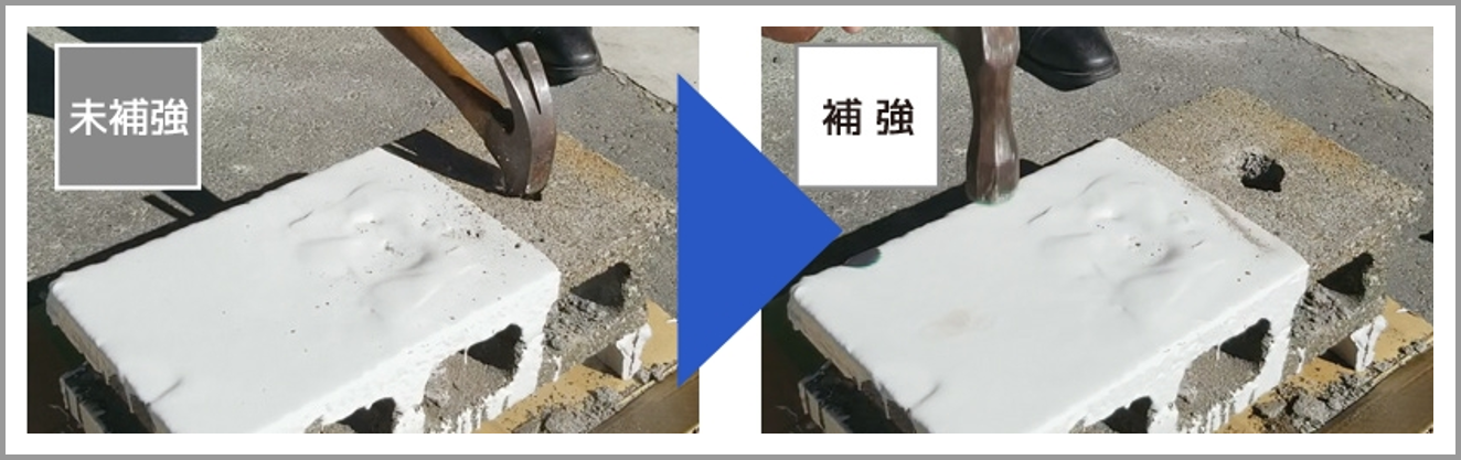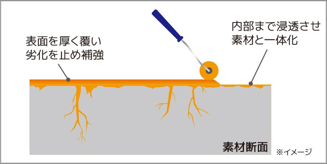 対象物の劣化した内部にまで新素材を浸透させ一体化させることにより、その表面を厚く覆い、圧倒的な強度を実現することができます。