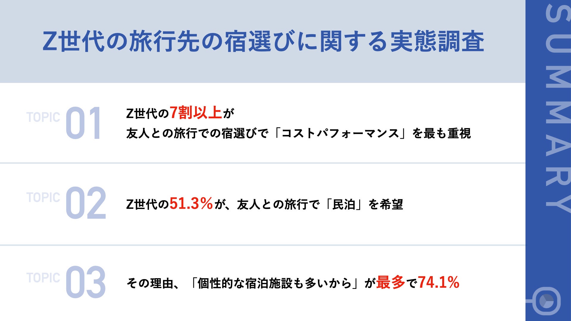 【Z世代に聞く旅行先の宿選び、トレンドは民泊!】Z世代の7割以上が友人との旅行で「民泊」を希望 ホテルには無いその魅力とは?