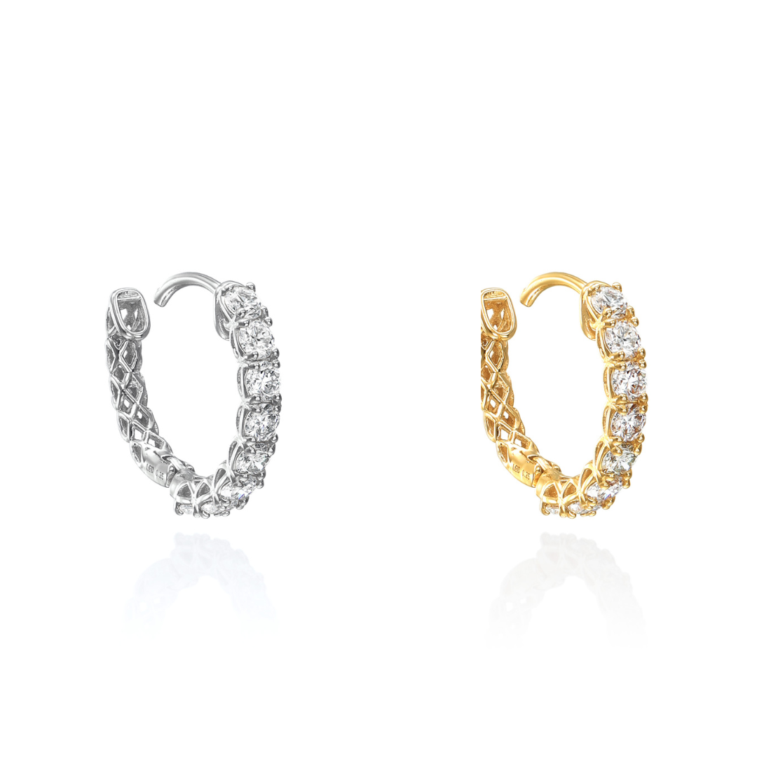 このダイヤモンドフープピアスは、日常のさまざまなシーンで活躍し、特別な場にもふさわしい高級感あるデザインとなっています。ゴルフやピラティスなど軽いスポーツの時などにも大活躍するフープピアスです。