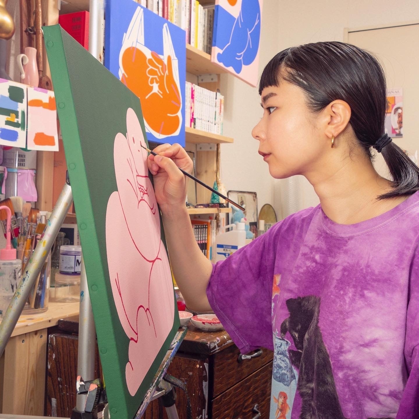 1993年東京都出身。2020年からイラストレーター・アーティストとして活動を始める。幼少の頃から習っていたダンスの影響で身体を使った表現に関心を持ち、身体の伸縮によって生まれる張りやシワの美しさに着目したふくよかな体型の人物を描いている。開放的なキャラクターたちがユーモラスに描かれる作品に海外からのオファーも急増。韓国でのアートフェア出展が決定するなど、その活躍を世界へと広げている。