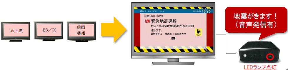 (1) テレビ電源がOFFの場合、専用端末がテレビを自動で立ち上げ、文字、画像及び光と音声で情報を告知します。