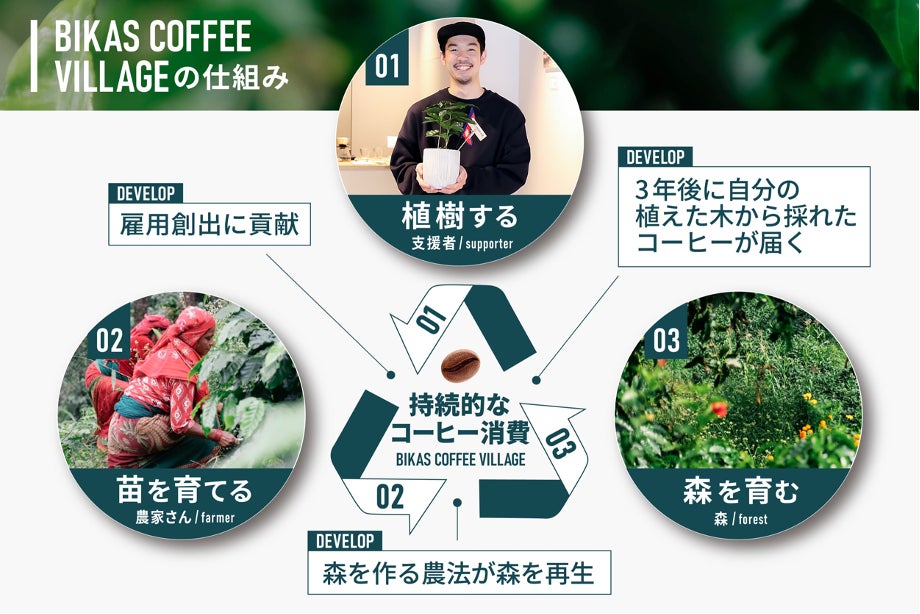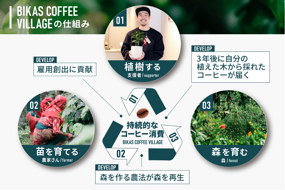 植樹プロジェクト「BIKAS COFFEE VILLAGE」は、ネパール連邦民主共和国(以下ネパール)で育てたコーヒーの苗を購入し名前が付いたコーヒーの木をネパールの村に植えることができるプロジェクトです。コーヒーの木を植えることで、3年後の食を楽しめるだけでなく、森を育みながらネパール農村部の農家さんの雇用支援につなげます。