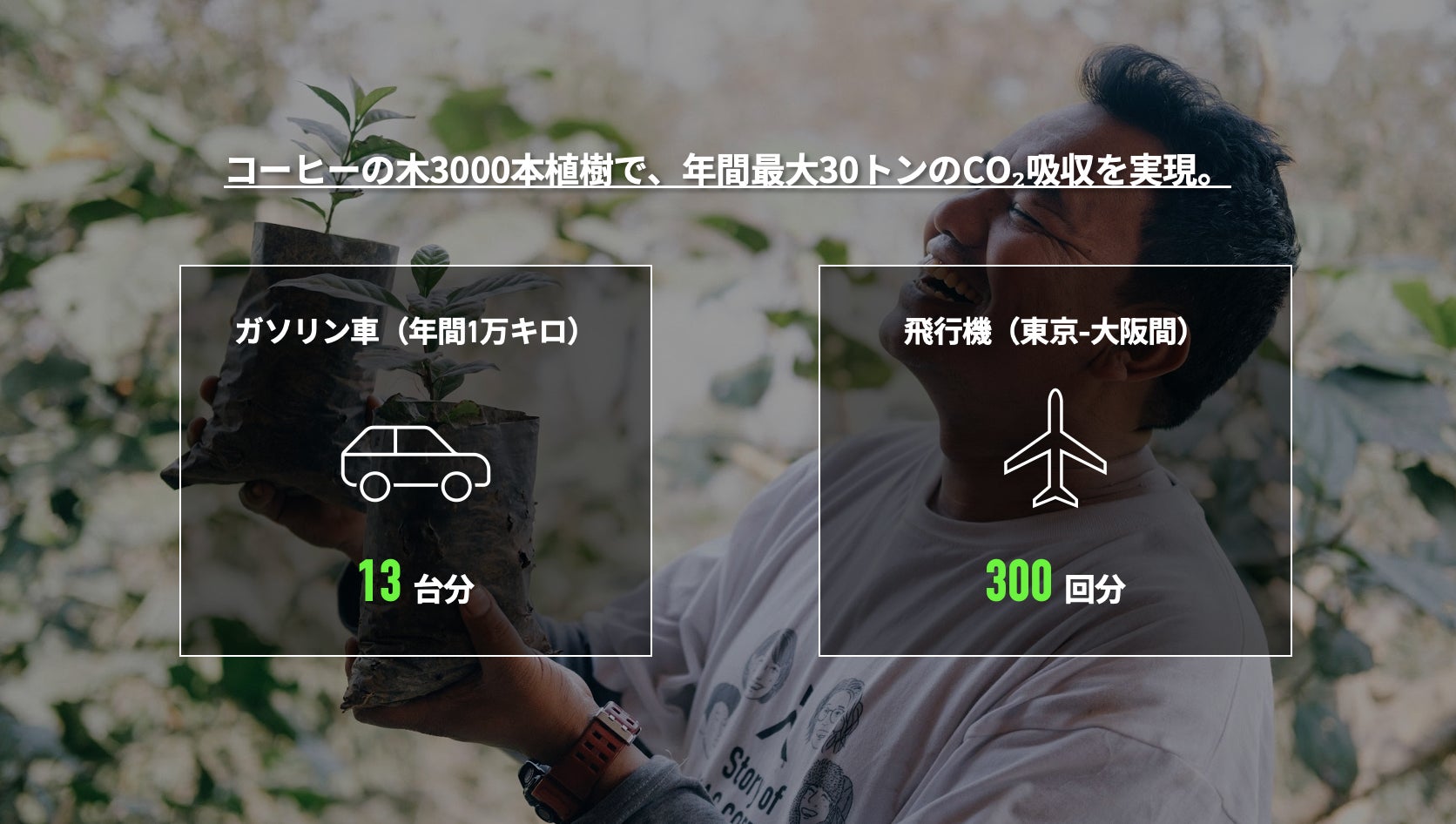 BIKAS COFFEEの植樹プロジェクトは、5年間で累計3,000本の植樹を行い、年間最大約30トンの二酸化炭素(CO₂)の吸収の効果が見込まれています※1。このCO₂吸収量は、ガソリン車で約10,000km走行する際の排出量に換算※2すると、およそ13台分あるいは東京〜大阪間の飛行機の片道移動に換算※3すると300回分に相当し、カーボンオフセット効果を大きく発揮しながら持続可能な農業と経済価値の両立を実現しています。