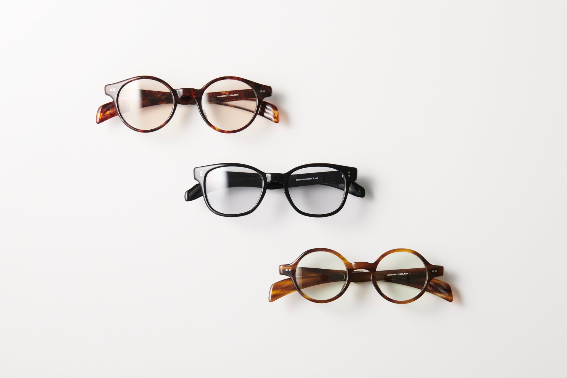 佐々木セルロイド工業所のDNAと言えるセルロイドを素材に採用し、当社が受け継いできた技術でその魅力を最大限に引き出したブランド。セルロイドはプラスチックメガネとして使われていた最古の素材であり、その加工の難しさから、今では鯖江でも製造可能な工場が、当社を含めてわずか数社に減っています。佐々木セルロイド工業所が誇る職人の磨きによるセルロイドならではの深い艶となめらかな肌当たり、テンプルに金属芯を使用しないことで素材の美しさを際立たせる“ノー芯製法”で、アイウェアの新たな魅力を発見していただきたいブランドです。