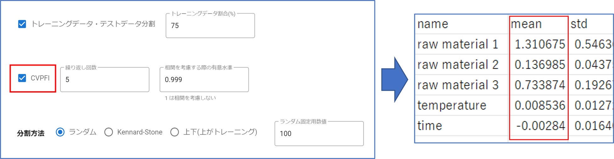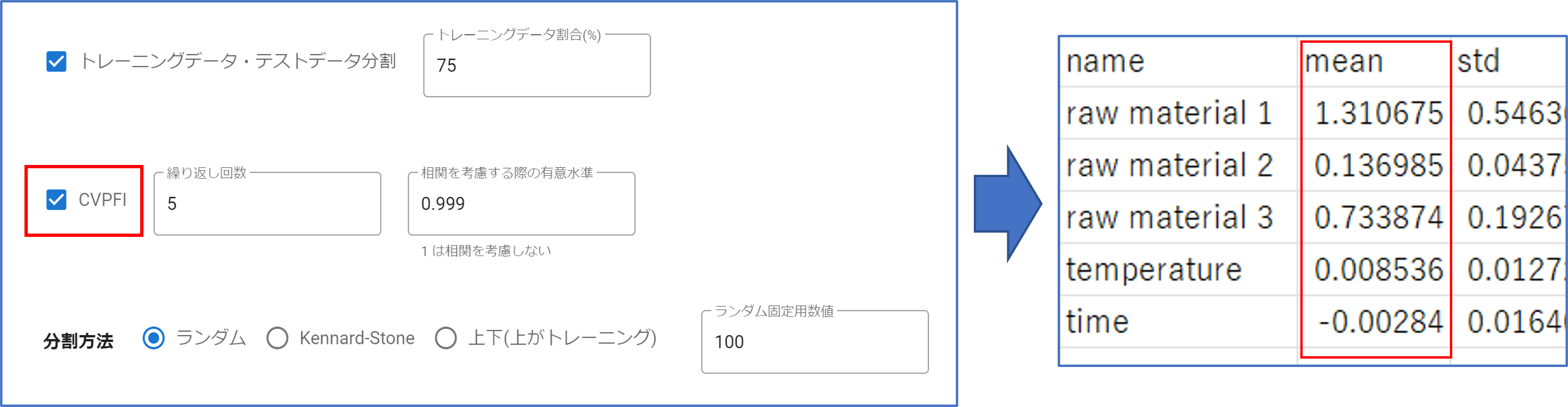 予測モデル構築時にCVPFIにチェックすると、各変数の重要度が出力(meanが0以上であれば予測に対して有意に影響)