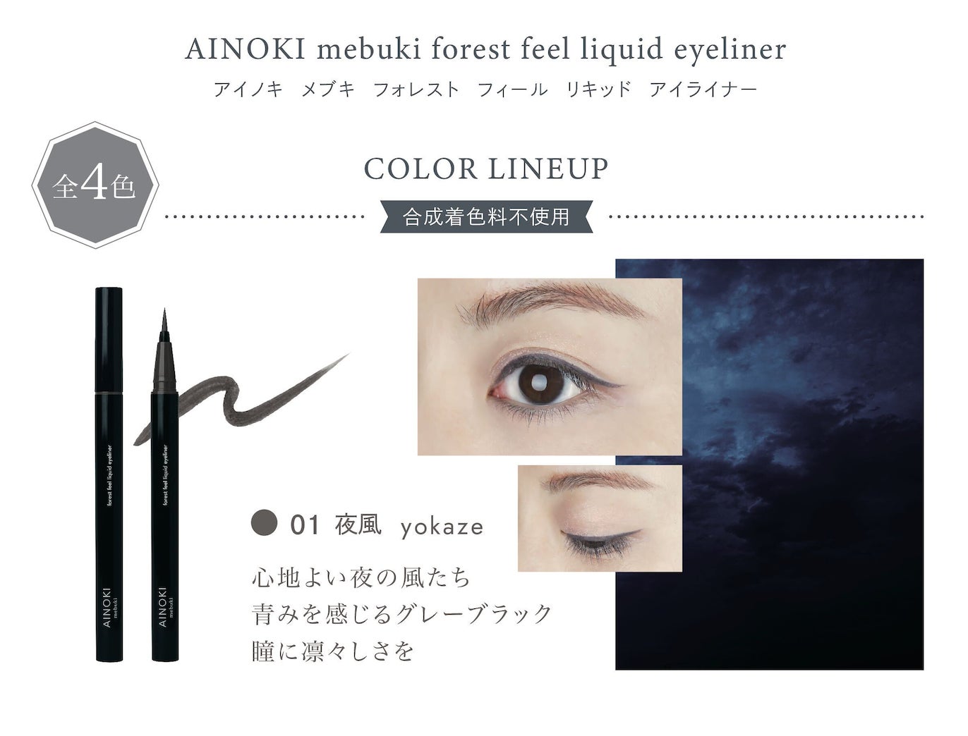 化粧品製造・販売をおこなうジャプロ株式会社(東京本社:東京都中央区日本橋小舟町8-6 H1O日本橋小舟町606)が展開する国産ヴィーガン、ナチュラルオーガニックコスメブランド「AINOKI mebuki(アイノキメブキ)」より、瞳の美しさを引き出す、リキッドタイプのカラーアイライナーを4色発売いたします。アイシャドウやカラーマスカラにも合わせやすいカラー展開です。