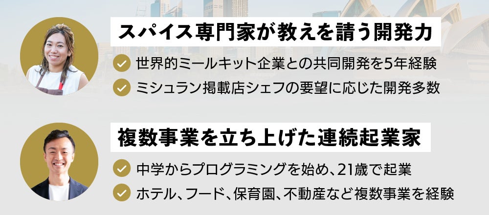 「Spice me」のレシピ開発は代表自ら指揮を取っています。創業前から、ミールキット大手(19ヵ国展開・2021年度売上規模8,000億円以上のグローバル企業)やミシュランシェフとオリジナルスパイスを開発するなど、豊富な知見を有しています。