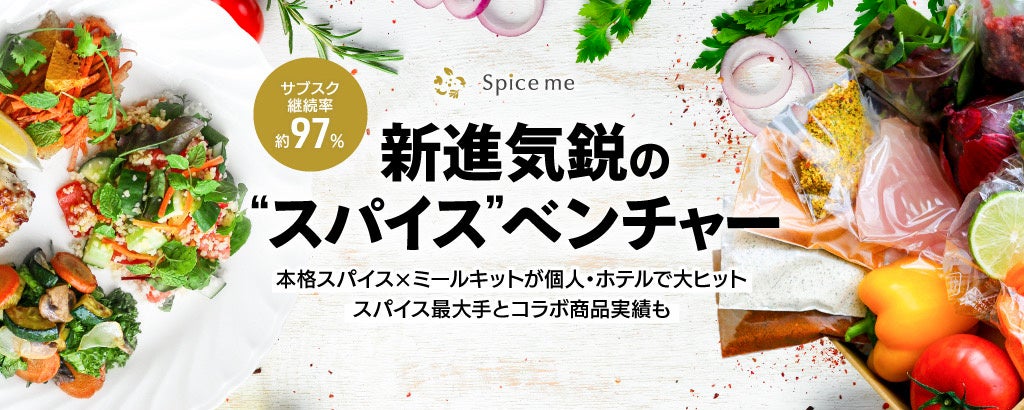 「Spice me」は、家にいながら「世界の料理」を手軽に再現できるミールキットです。多様なスパイスを活用した独自レシピと仕入れ当日配送の新鮮食材をセットに「健康」「時短」「本格」を備えます。レシピは、チュニジアのスパイス調味料「ハリッサ」を使った「ハリッサポークとパンプキンピラフ」や、中近東のポピュラー料理「羊のコフタ ビーツヨーグルトソース」といった世界のユニークな料理など100種類以上を開発しています。