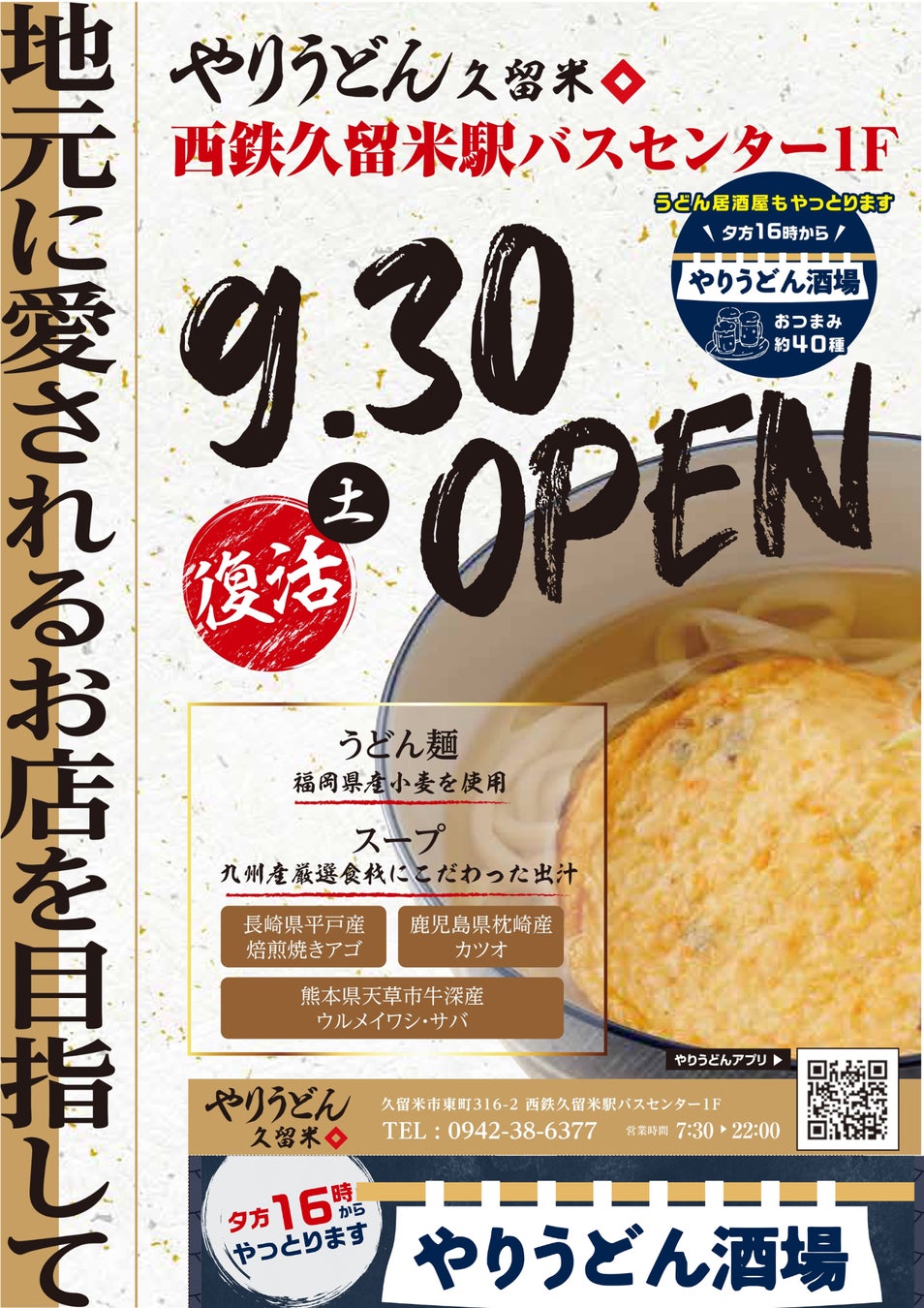 やりうどん久留米店が9月30日復活!西鉄久留米駅バスセンターにて「お客様の食べる幸せ」を広げます