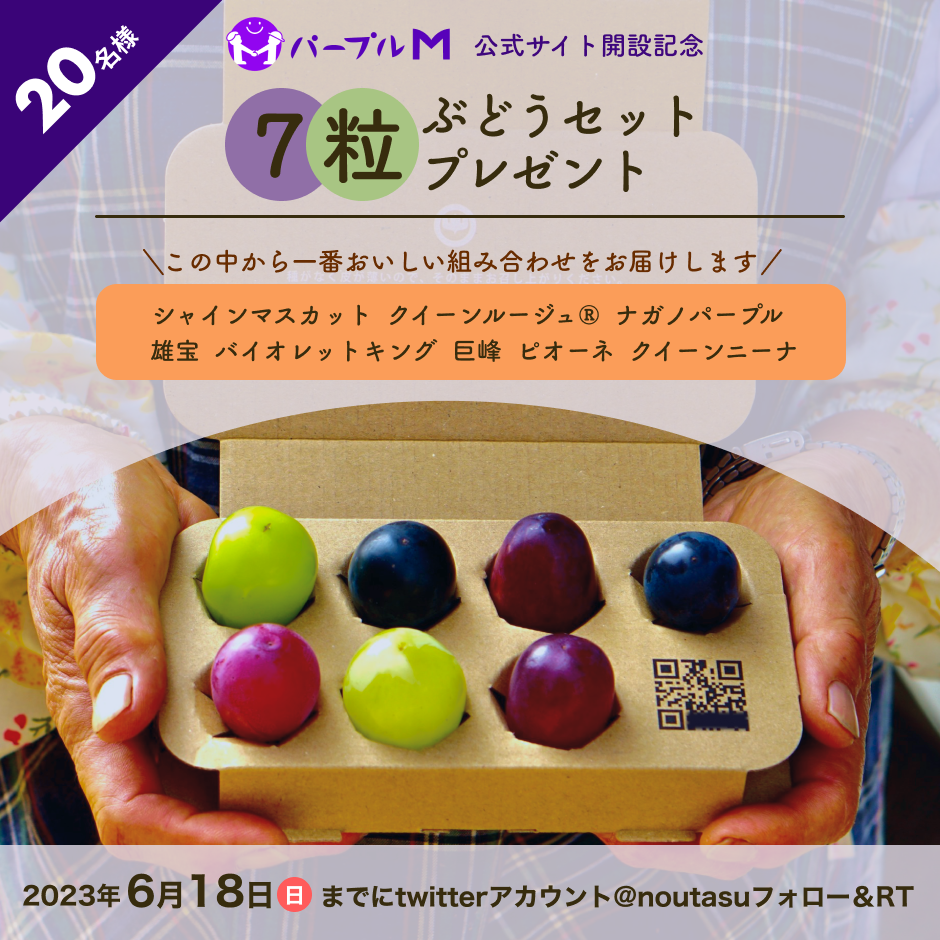 公式サイトのオープンを記念して、ノウタス取締役の岡木が運営する岡木農園より抽選で20名様に「7粒のぶどうセット」をプレゼントするキャンペーンを実施します。(ナガノパープル、クイーンルージュ、バイオレットキング、シャインマスカットなどの詰め合わせを予定しています。※収穫状況により品種の変更が発生する場合がございます)