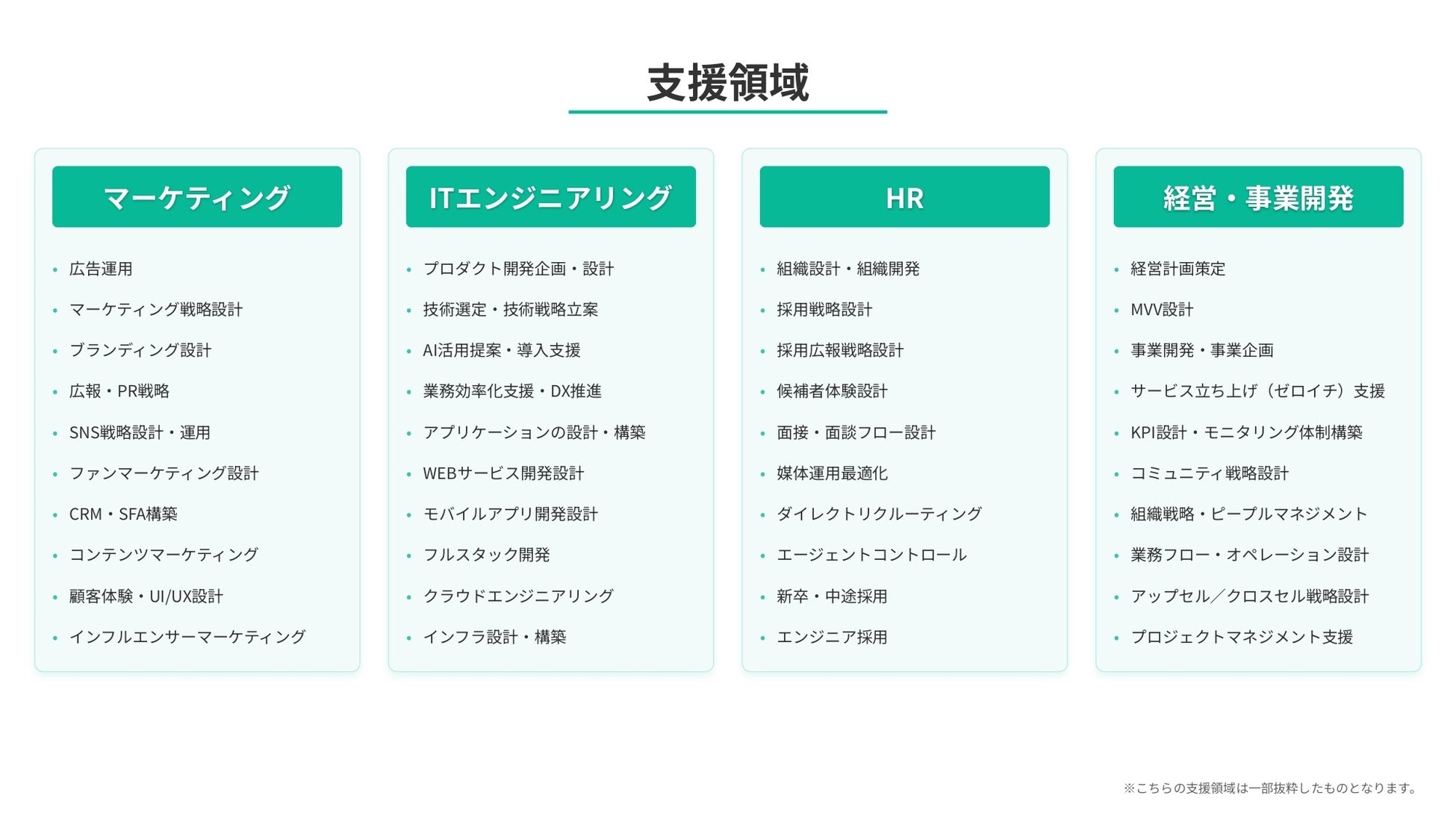 マーケティング・ITエンジニアリング・HR・事業開発など各分野の現役プロフェッショナル人材が多数在籍しています。戦略立案から実行までの幅広いフェーズにおいて抽象から具体まで、ワンストップでのご支援が可能です。