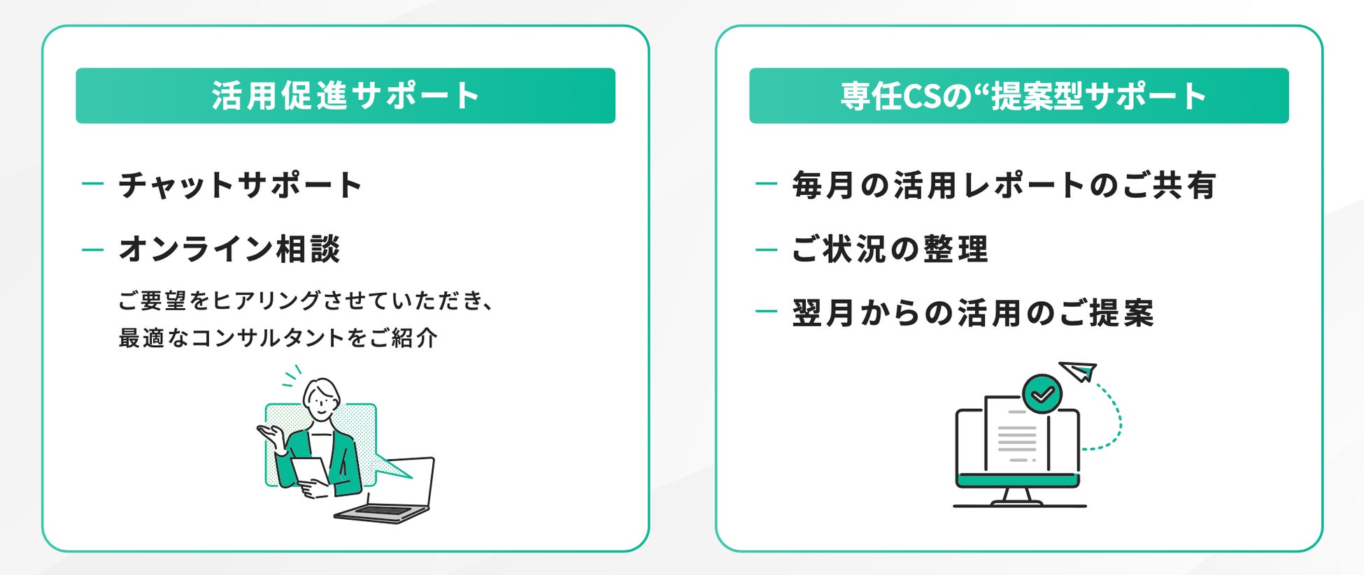 選考通過率1%のプロが、戦略設計から実装・運用までハンズオンで伴走。目先の成果にとどまらず、継続的な成果を生むナレッジを共有し、社内で再現できる仕組みを築きます。さらに専用のカスタマーサポートも充実しているため、導入から運用、成果検証まで一貫して手厚いフォローを受けられる環境をご用意しておりますので、ご安心ください。