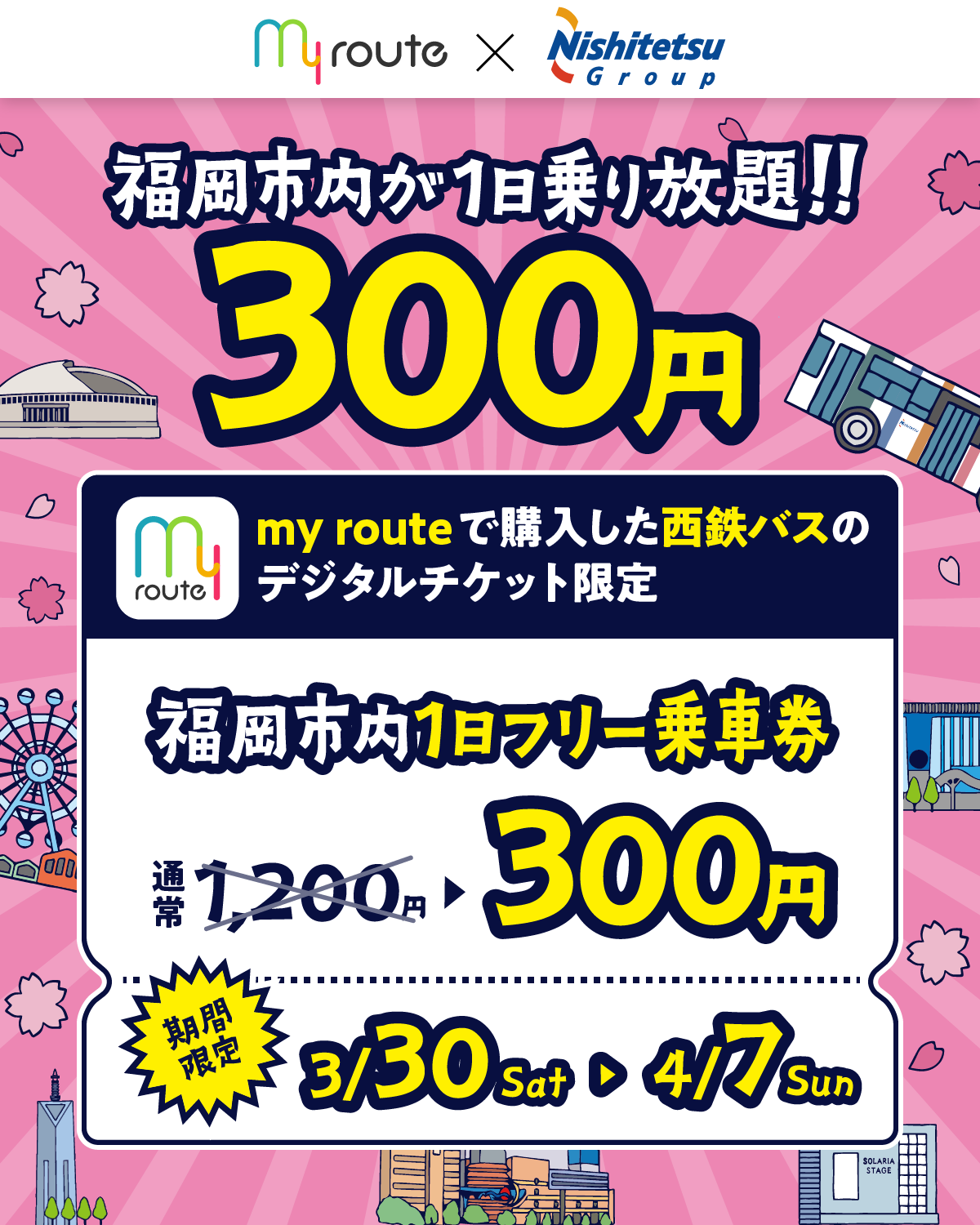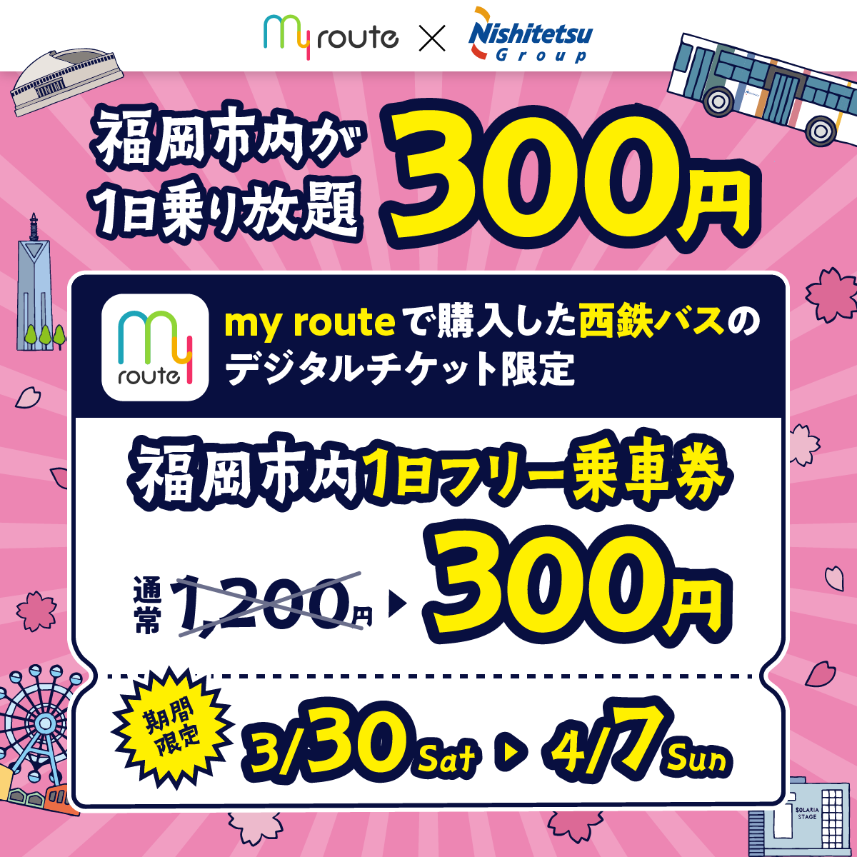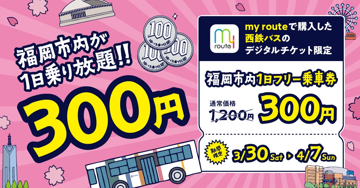 3月30日(土)から4月7日(日)限定で「福岡市内西鉄バス一日乗り放題チケット」が通常1200円が300円に。my routeと共に福岡市の魅力を発見しませんか