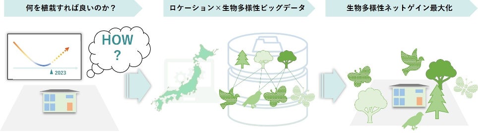 生物多様性保全活動の促進につながる本方法論を発展させ、今回は住宅地への植樹等の緑化を通じた「生物多様性ネットゲイン」とその算出方法の標準化を推進します。「生物多様性ネットゲイン」とは、住宅地や開発地における生物多様性保全に留まらず、生物多様性の回復に向け生物多様性を増やすことです。取り組みとしては、「生物多様性ネットゲイン」につながる住宅建設に関する新たな商品・サービス、ビジネスモデル、その他の実現アイデアの創出および啓発活動を行います。例えば、今後の住宅建設予定地における植栽提案において、「生物多様性ネットゲイン」を最大化できる植栽の樹種・本数のシミュレーション提案ツールの導入を検討しています。 算出にあたっては、「5本の樹」計画やシンク・ネイチャーの生物多様性ビッグデータ、A Iの活用をしていきます。
