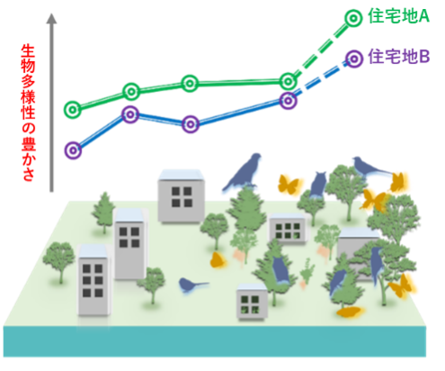 このような社会的変化に先立ち、積水ハウスは2001年から都市の住宅地に地域の在来樹種を中心に植栽し、緑のネットワークを作ることで、生物多様性保全・再生を推進する「5 本の樹」計画に取り組んでいます。この効果を琉球大学理学部久保田研究室及び株式会社シンク・ネイチャーと共同検証し世界初の都市の生物多様性の定量評価の仕組みを「ネイチャー・ポジティブ方法論」として2021年に公開いたしました。