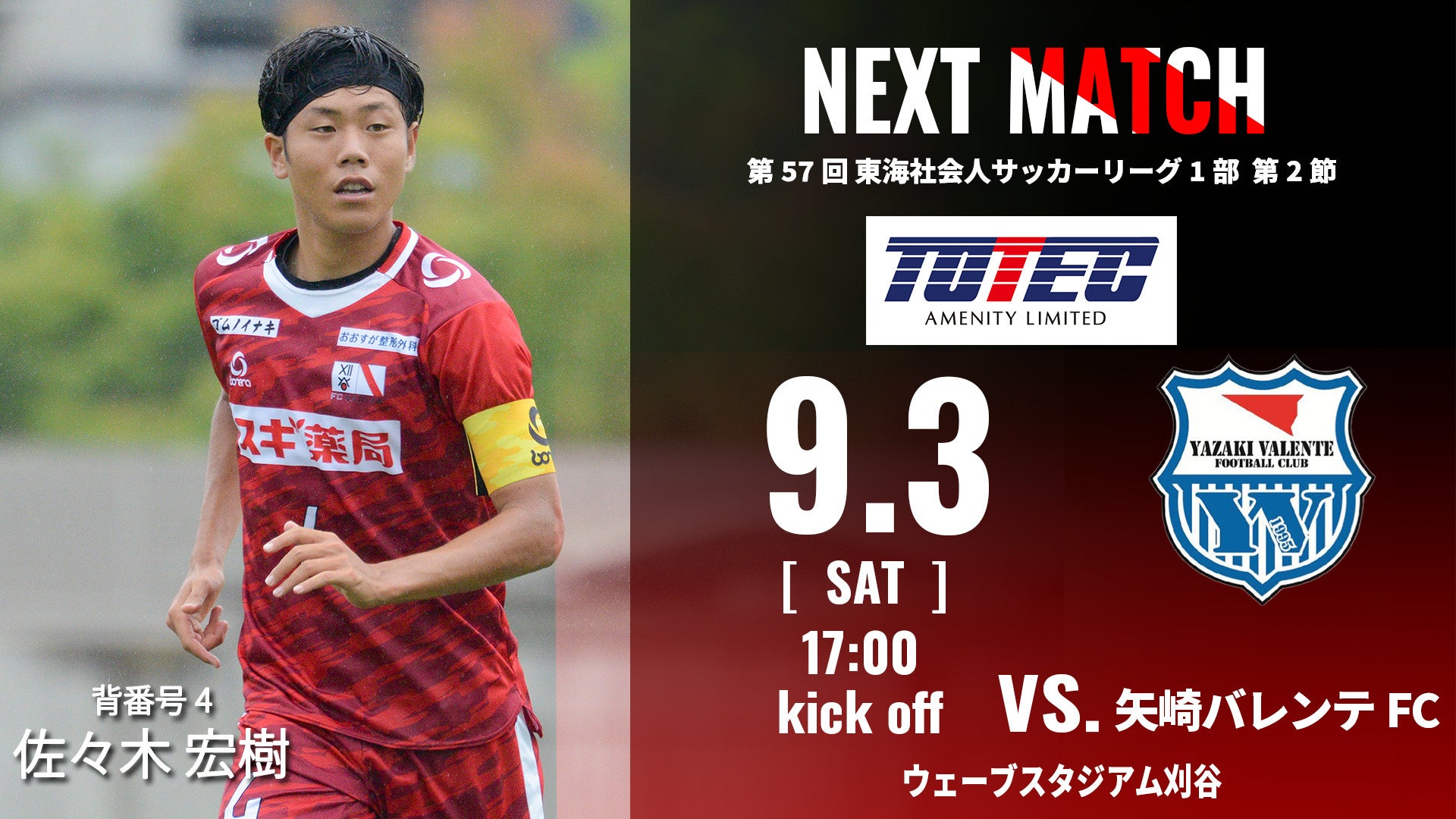 9/3(土)第57回東海社会人サッカーリーグ1部第2節トーテックアメニティPresents矢崎バレンテFC戦の試合情報