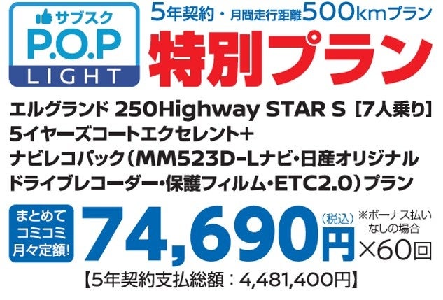 P.O.Pライトプラン(月間走行距離500km・5年契約)の場合、5年契約(60回お支払い)で定めた月額でも、「3年後以降乗りかえ特約」がついているため、車検取得前の3年目に新型エルグランドをはじめとした新車への乗りかえを検討できます。