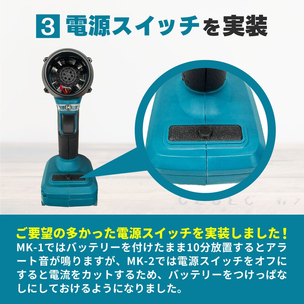 「MK-1」ではバッテリーからの電流を遮断するスイッチがありません。そのため、バッテリーをつけっぱなしにした状態で10分を超えると警告音のアラートが鳴る仕様ですが、「MK-2」では電源スイッチを実装したことで、バッテリーを装着したままでも電流を遮断し、そのまま放置しておけるようになりました。
