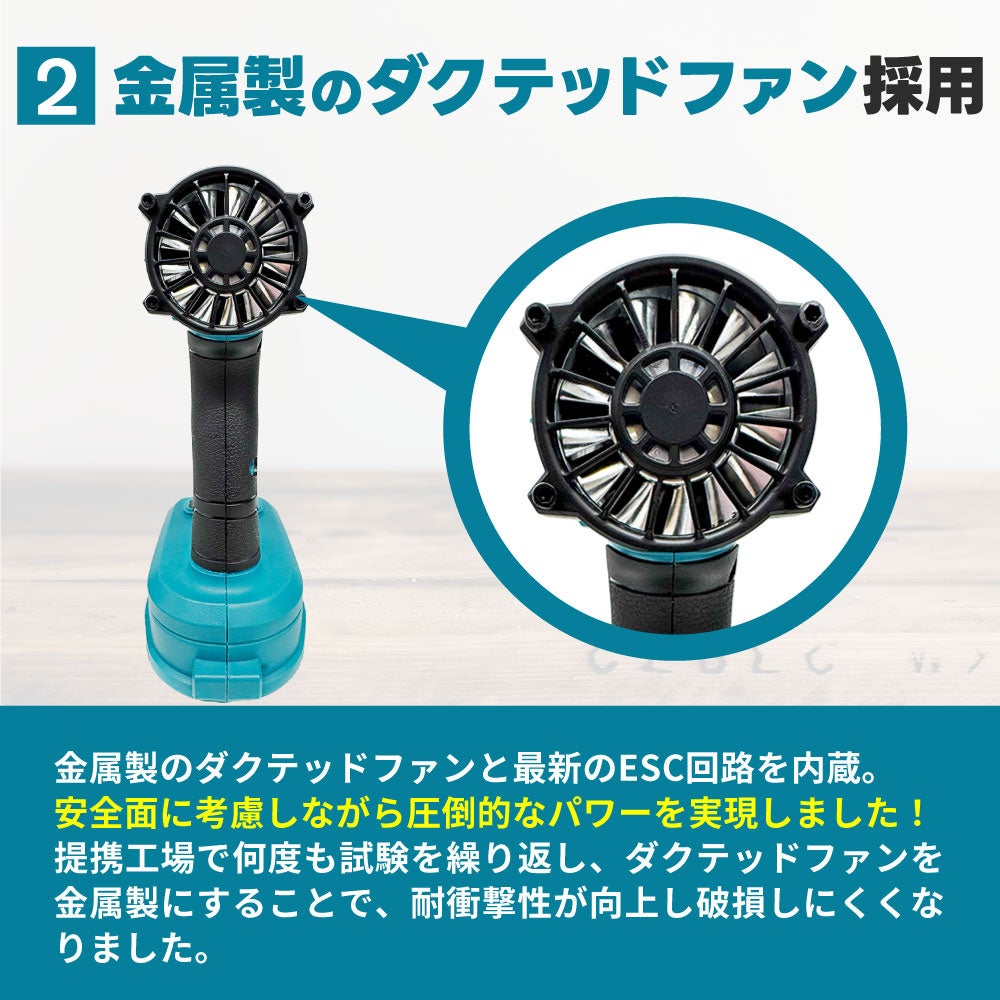 80000回転/分の超高速ブラシレスモーターの圧倒的なパワーを活かすためにESC回路のピーク電流、PWM制御機能の改善を繰り返し、同型の他社のブロワーと比べても圧倒的な風力を実現すると同時に、安全面でも背面の巻き込み防止ファンガードをハニカムメッシュ構造に変更し、ESC回路のヒートシンク構造などの改善を重ねてきました。