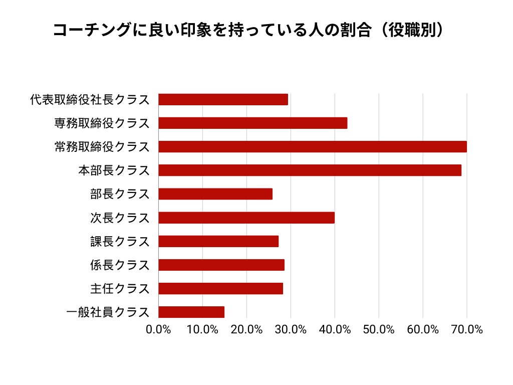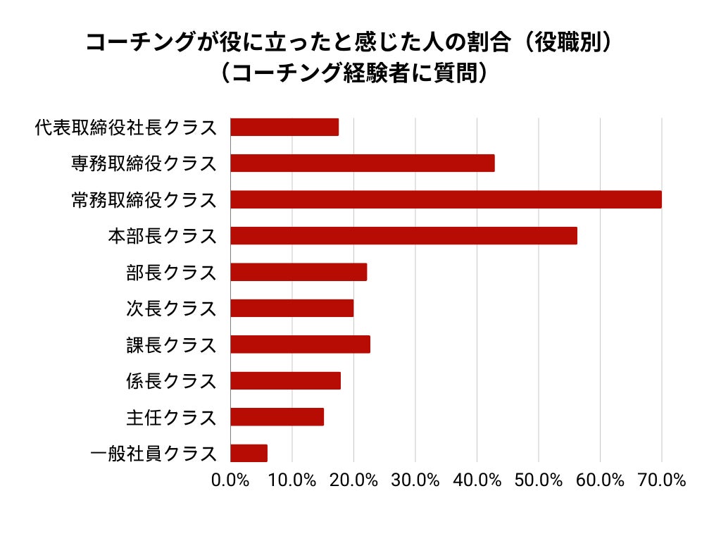 コーチング経験者の常務取締役クラスの70%が「コーチングが役に立った」と回答し、一般社員クラスは6%のみが「コーチングが役に立った」と回答