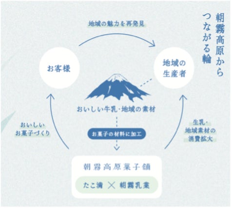富士山や朝霧高原の自然をモチーフにしたユニークなお菓子を通じて、社会課題である”牛乳離れ”に向き合い、お客様・生産者・地域それぞれに持続可能な”Good cycle”を生み出すエシカルなブランドを目指しています。