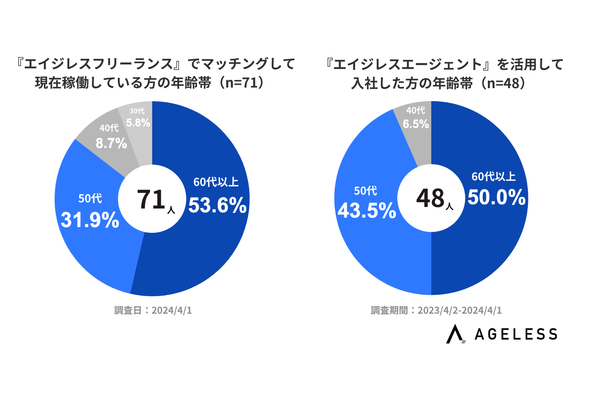 「50歳以上で新たな活躍機会を見つけるのは難しい。」そう思われていた固定概念が、この数年で大きく変わってきました。今回の調査結果はまさにこの変化を証明しているのではないかと思います。エイジレスは今後も、50代以上の活用に積極的な企業の更なる啓蒙・開拓を進めるとともに、「70代までのキャリア戦略を立てられる」エージェントサービスとして、より広い世代の求職者への価値提供を行っていきます。