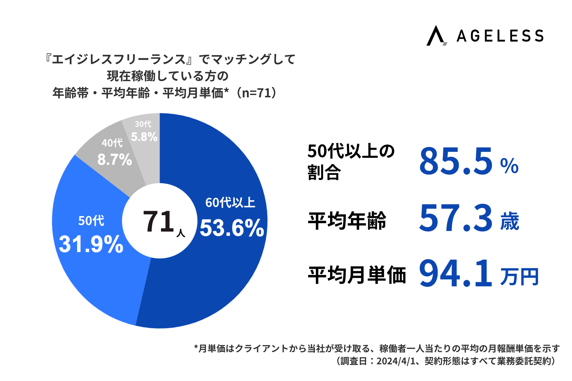 エイジレスでは、主にミドル〜シニア層に対して人材関連サービスを展開しています。フリーランス向け案件マッチング事業『エイジレスフリーランス』でマッチングして現在稼働している方の年齢帯を調査したところ、60代以上が53.6%、50代が31.9%で、合わせて85.5%となりました。また、平均年齢は57.3歳、月平均単価は94.1万円となりました。