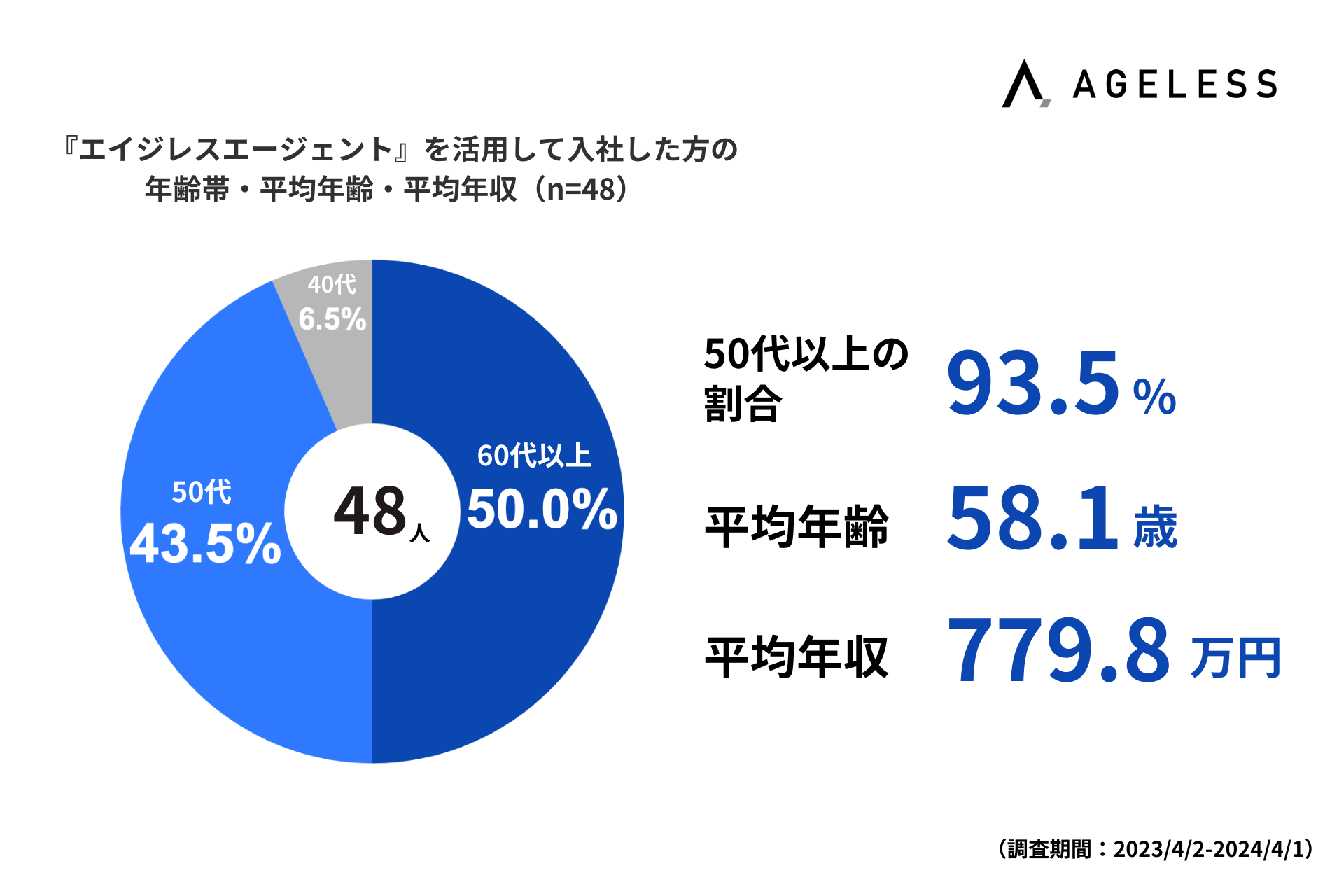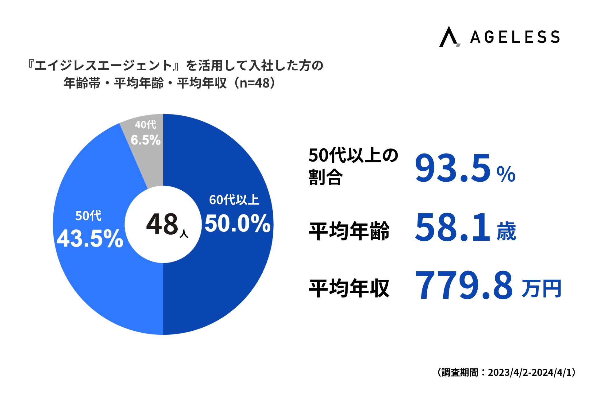 また、人材紹介事業『エイジレスエージェント』において、直近1年(2023年4月2日から2024年4月1日)で入社した方の年齢帯を調査したところ、60代が50.0%、50代が43.5%で、合わせて93.5%となりました。また、平均年齢は58.1歳、平均年収は779.8万円となりました。