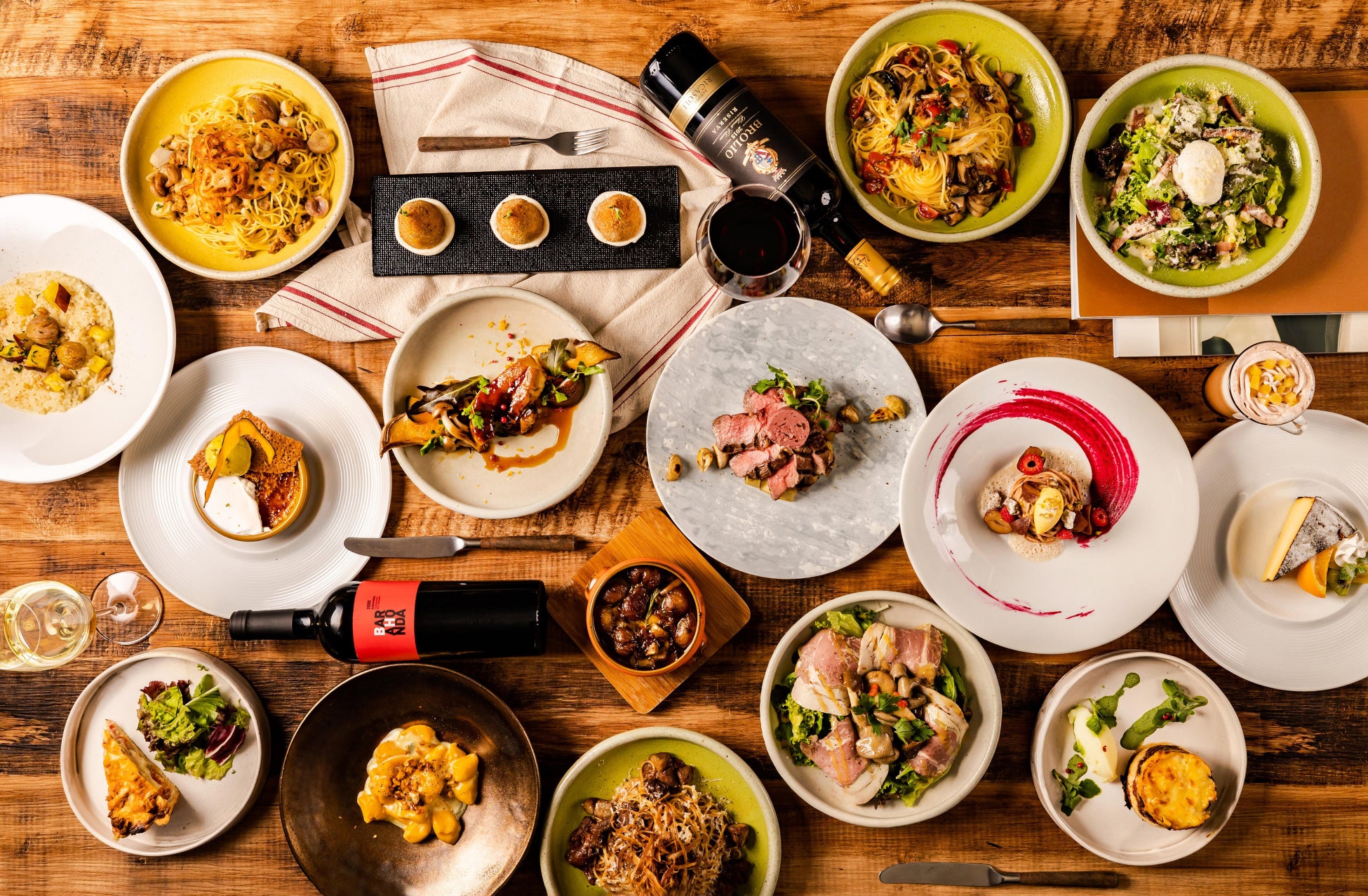 四季に合わせて、旬の食材を盛り込んだ本格派メニューを気軽に楽しめるKIHARU Brasserie。今秋は、栗、さつまいも、かぼちゃ、れんこん、ごぼうなどをそれぞれ掛け合わせた秋の実りたっぷりのメニューをお届けします。パスタ&リゾットの新作として、ほくほくしたローストのさつまいもとほんのり甘い栗のリゾット、クセになるゴルゴンゾーラソースで煮込んだかぼちゃのニョッキ、シャキシャキれんこんの甘さとハーブ香るサルシッチャのラグービアンコなど6種が登場。また、赤ワインと栗の甘露煮で作った自家製の濃厚マロンバターを添えたサーロインステーキ、紫芋とホワイトチョコレートを仕込んだフォンダンショコラなど、メインやデザートにいたるまで秋らしく揃えます。