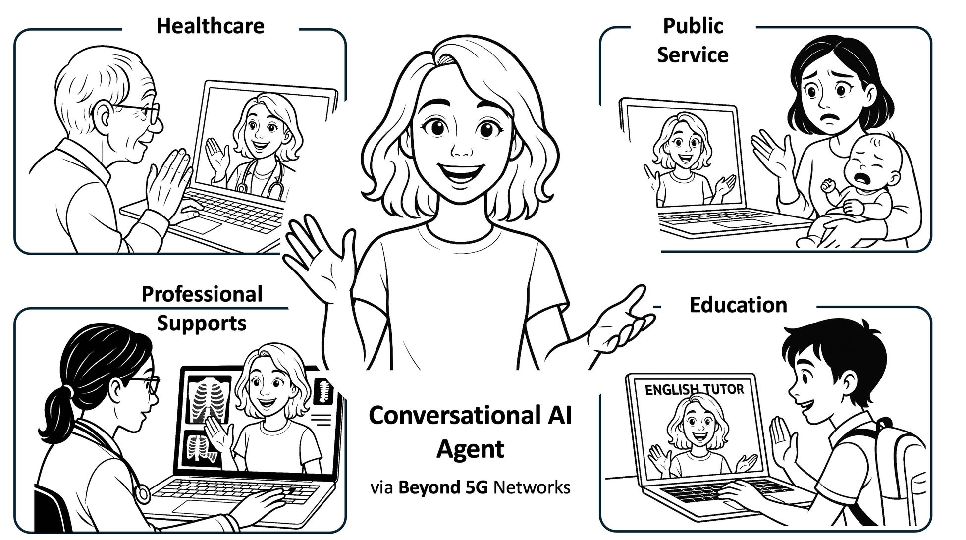 Beyond 5G時代には、高信頼を前提とするマルチモーダル会話AIが、医療・教育をはじめとした公共サービスにおいて社会インフラとして機能することが期待されている。一方、音声・言語・非言語を統合する高密度な対話体験に対して、信頼性を客観的に評価する基盤は未整備である。本研究では、多様なユーザー行動を模倣するマルチモーダル・エミュレータ、対話品質を多軸で評価する自動スコアリングモデル、B5G通信環境に最適化されたネットワークアーキテクチャ、および評価フレームの共通参照枠と標準化手法を統合的に開発・検証し、日本発モデルとして世界の会話AIエージェント産業の本格的な立ち上がりを牽引することを目指す。