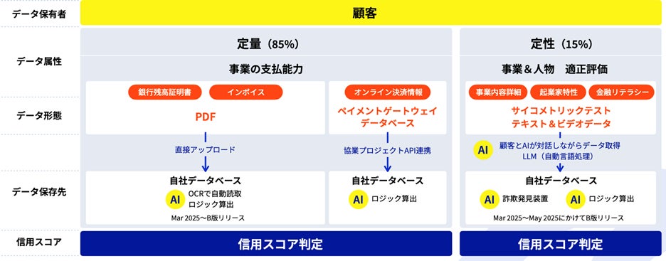 定量データが弱い中小企業向けに、定性データを活用する独自スコアリング評価を採用しています。今回リリースしたバージョンでは定量データでOCRを活用しています。今後は、定性データ取得にLLM(自動言語処理)など積極的にAI活用しながら、効率性や利便性を高めていきます。
