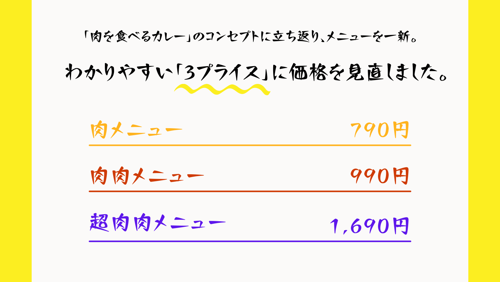 わかりやすい3プライスに! 「肉か肉肉か超肉肉か」