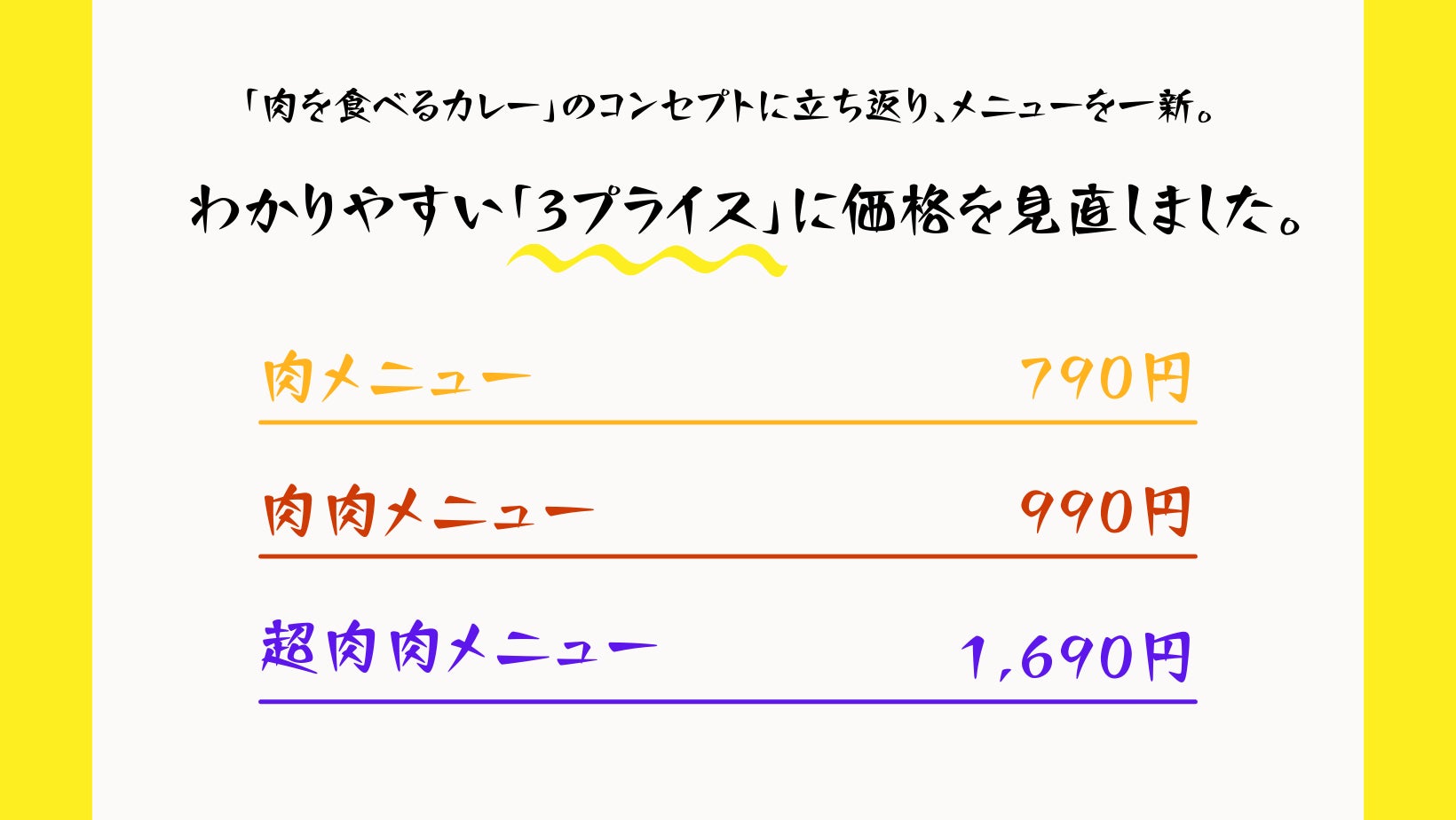 「肉とカレーのお店マイティ」は今年1月に1号店がオープンしました。一流外食チェーン出身のチーフシェフが開発に携わる当店のメニュー数はこの半年間で当初の17種類から最大28種類まで増え、それに伴い価格帯も390円〜2,200円まで幅広く存在。券売機の前でどのメニューを購入すべきかわからず困っているお客様を見る機会が少なくなく店舗スタッフとしても課題認識がありました。そこでこの度グランドメニューをがらっと一新し、価格帯を「肉メニュー790円」「肉肉メニュー990円「超肉肉メニュー1,690円」の3つ(18メニュー)に絞りました!(※一部メガ盛りを除く。全て税込価格。亀戸店のみ先行実施。落合店は追って実施予定)