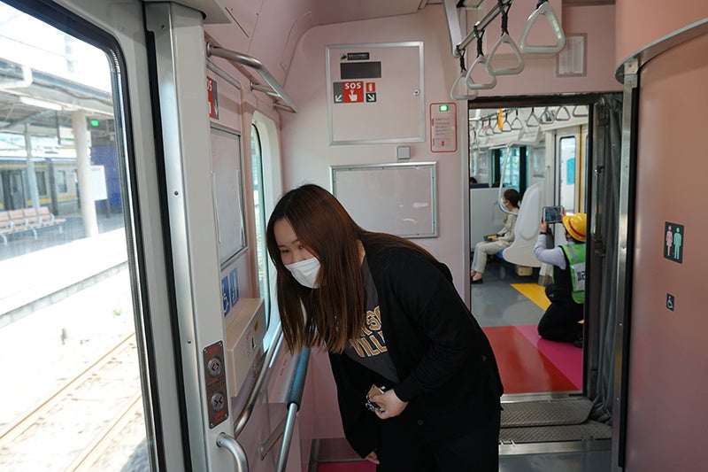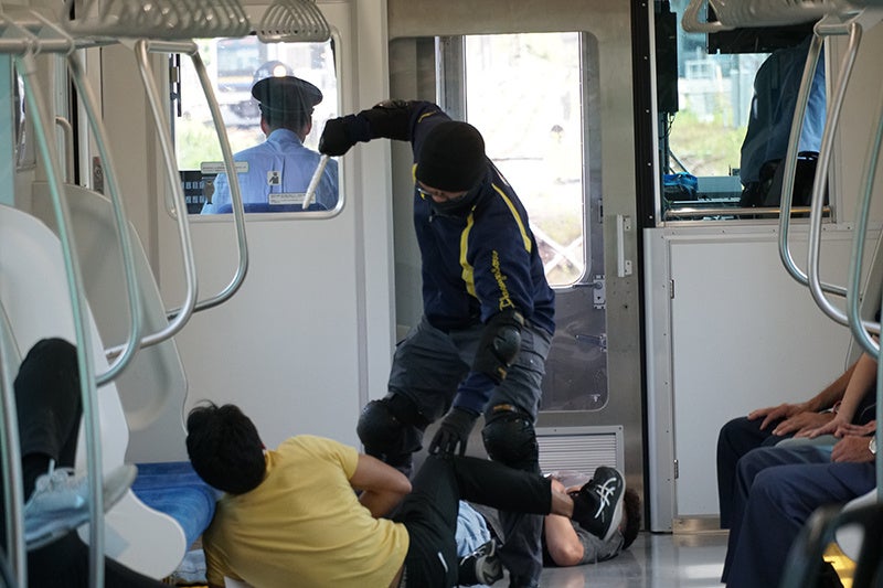当日は、車両内での事件を想定した対策から、津波避難、さすまた訓練と幅広い防災訓練を行いました。特に、車両内での事件の際には、本学の学生が外部との連絡役を務め、迅速かつ正確な情報伝達を行いました。