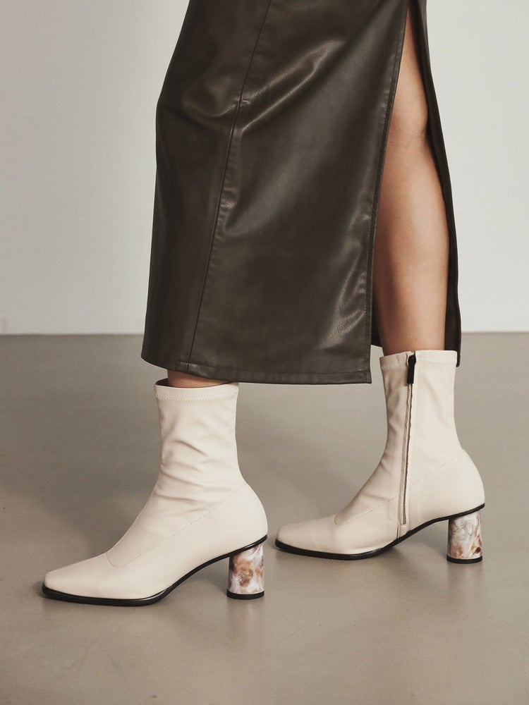りんごの素材を使用したショートブーツです。太めのヒールで安定感があり、ユニークなデザインでコーディネートのポイントになるアイテムです。