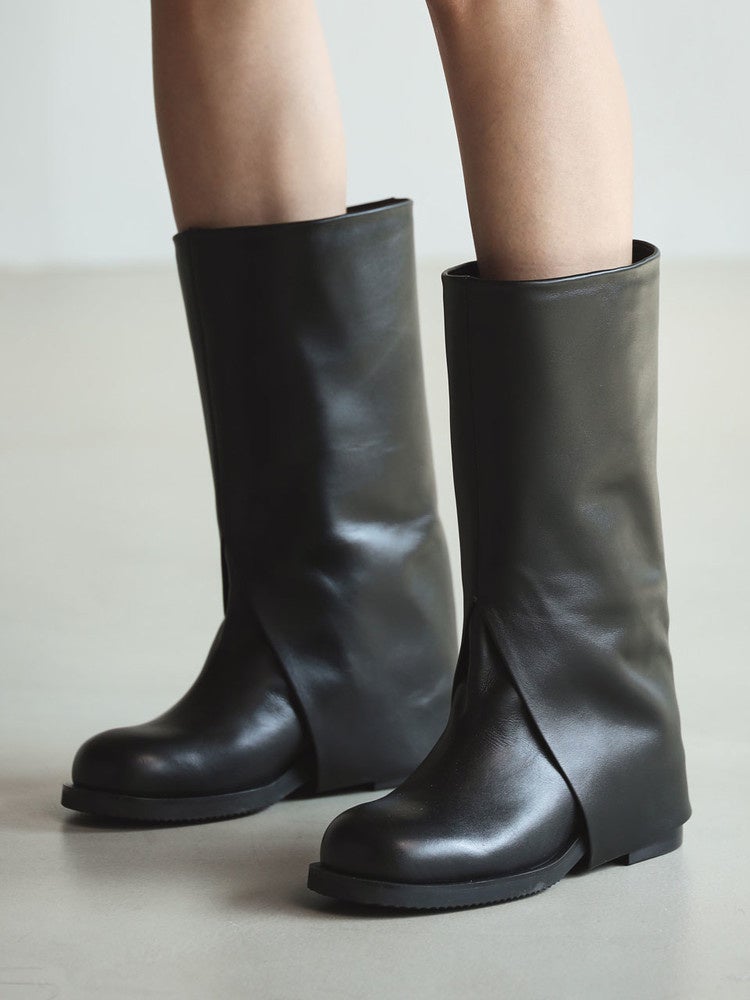レッグウォーマーを着用しているかのような高級感のあるユニークなデザインのミドルブーツです。足首が太めのデザインで足を細く、5cmの隠れヒールで足を長く見せてくれ、いまどきのY2Kコーデが完成できます♪