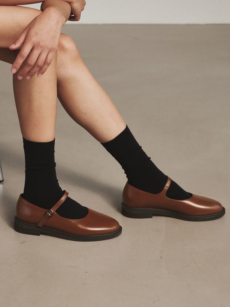 ミニマルでクラシックなデザインのメリージェーンシューズです。かすかな光沢で高級感があり、主に男性シューズに使用される厚みの素材使用で製品のシルエットを長く維持できます。
