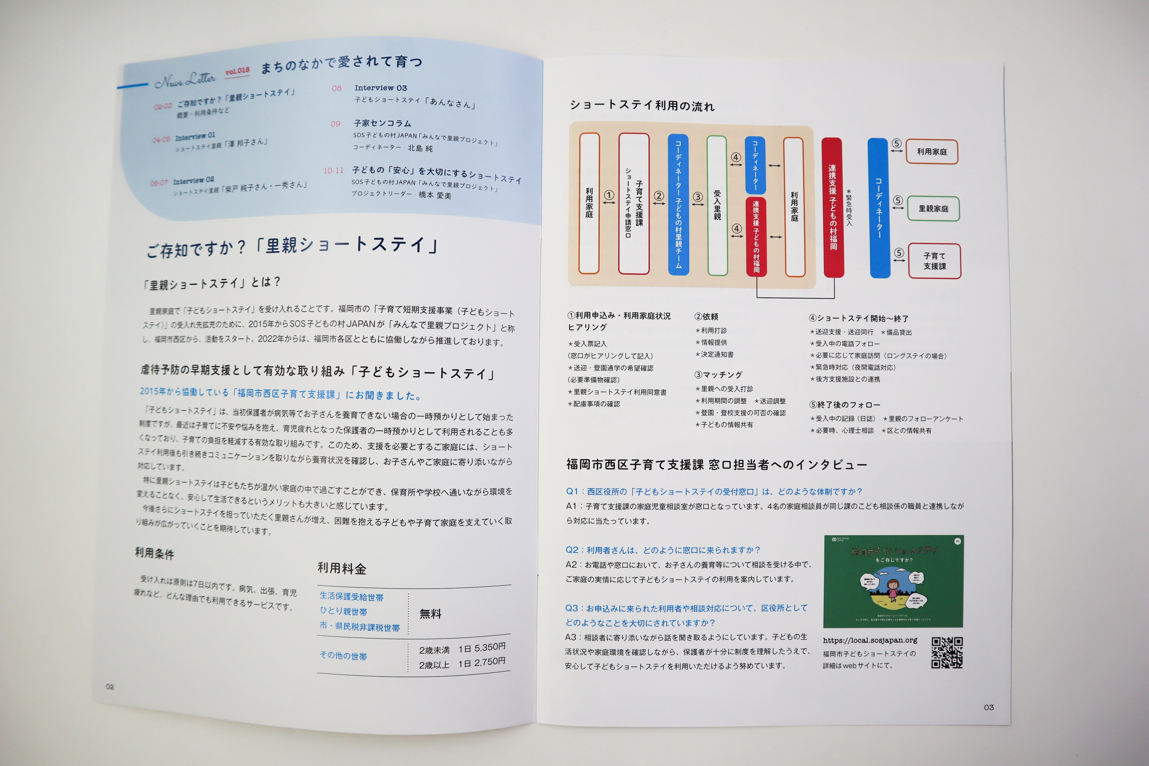 News Letter Vol18.では「まちのなかで愛されて育つ」と題し、SOS子どもの村JAPANが取り組む、里親制度を活用した地域の家族支援「里親による子どもショートステイ」の取り組みを紹介。ショートステイ里親としてSOS子どもの村JAPANと協働している里親や実際の利用者へのインタビュー、当法人の「みんなで里親プロジェクト」運営メンバーのコラムを掲載しています。